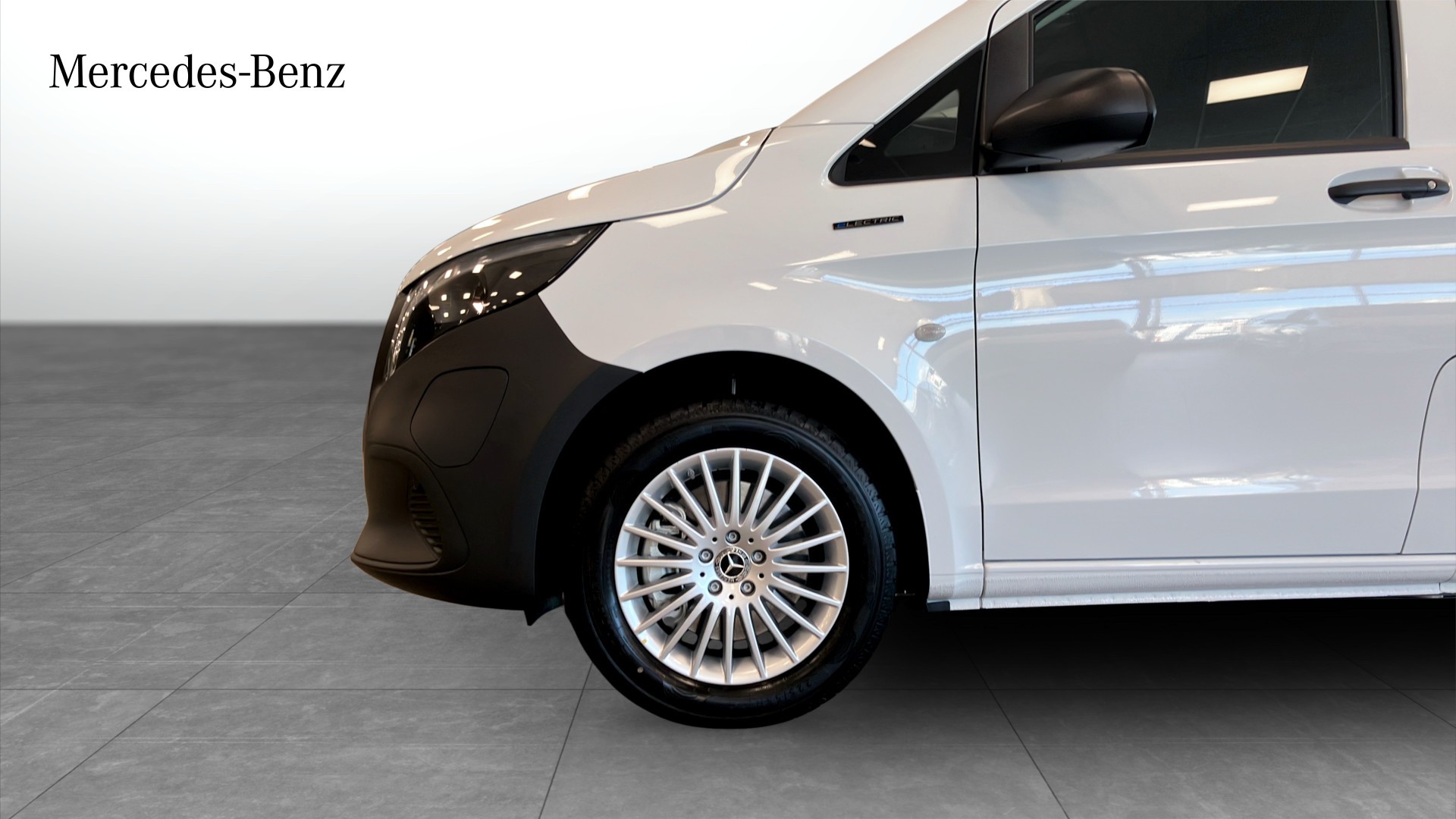 Mercedes-Benz eVito 112 Skåp Lång, årsmodell 2025, i vit kulör. En helelektrisk transportbil som kombinerar smidighet, komfort och låga utsläpp med den kvalitet och känsla man förväntar sig av Mercedes-Benz.