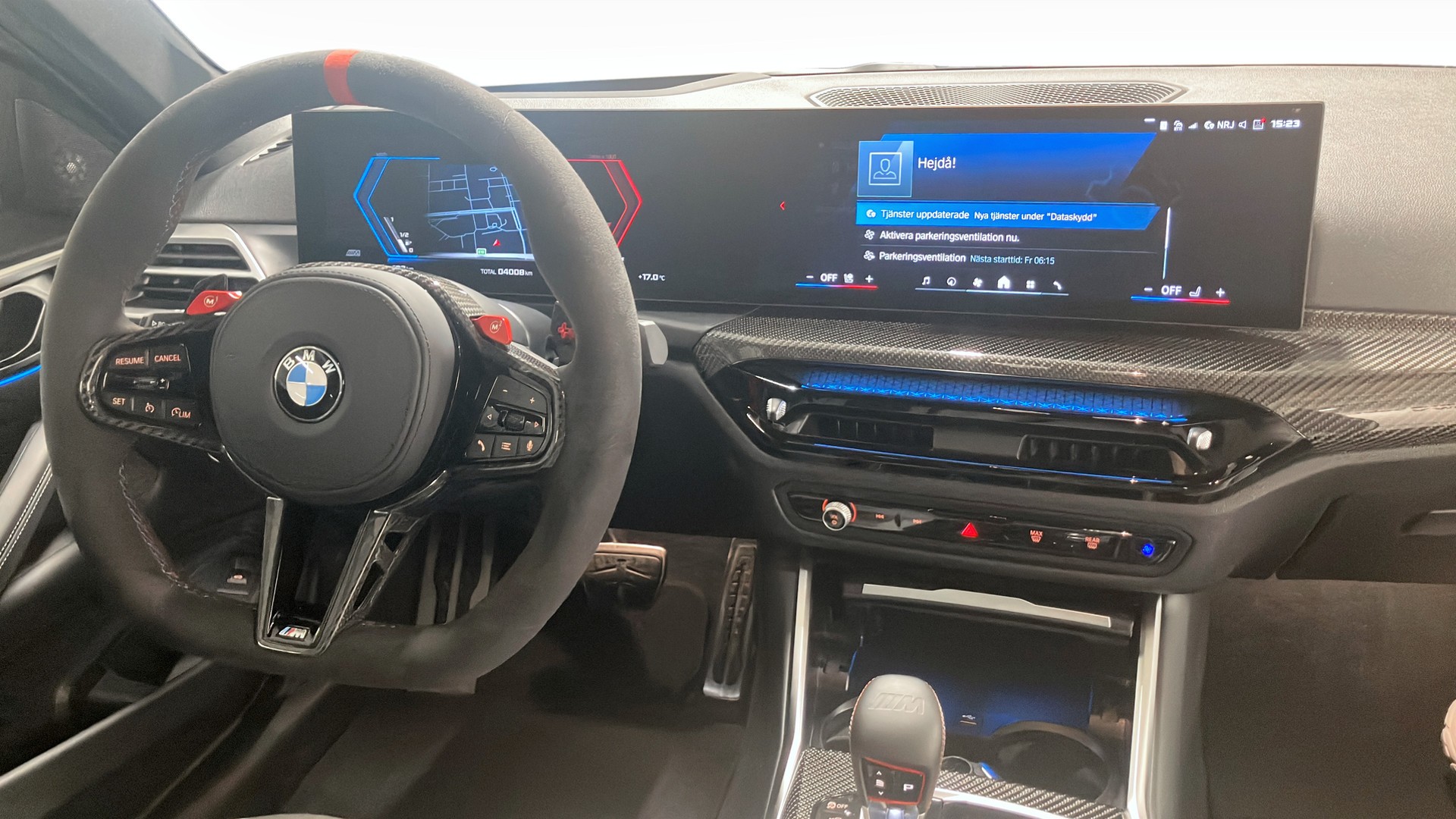 Invändigt möts du av läckert Läder Merino Silverstone/Black, M Sportstolar fram med elektrisk inställning och minne, svankstöd och stolsvärme. M Alcantara-ratt med rattvärme, BMW M antracit innertak och interiörlister i M kolfiber förstärker den sportiga känslan.