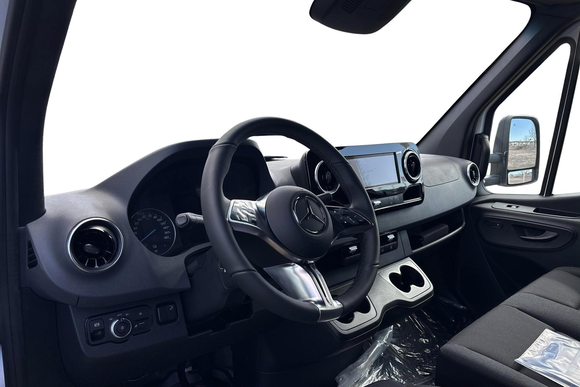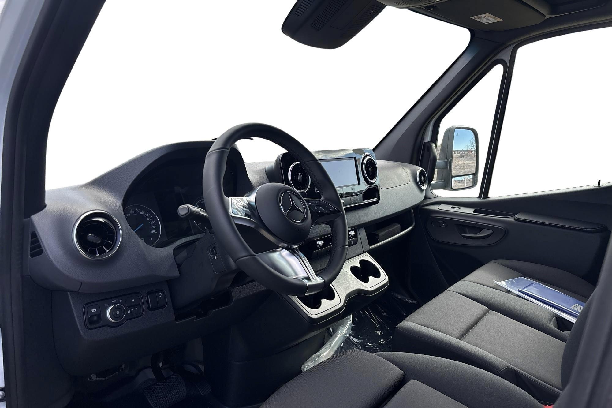 Förarplatsen är byggd för långa arbetsdagar: fjädrande komfortsäte med svankstöd och armstöd, uppvärmda framstolar, multifunktionsläderratt (uppvärmd), hylla ovanför vindrutan, förvaringsfack och mugghållare. MBUX multimediasystem med färgdisplay, digitalradio (DAB), smartphoneintegration samt fri kartuppdatering i 3 år gör vardagen enklare. Förklimatisering och vinterpaket plus med el-tillsatsvärmare hjälper dig genom kalla morgnar.