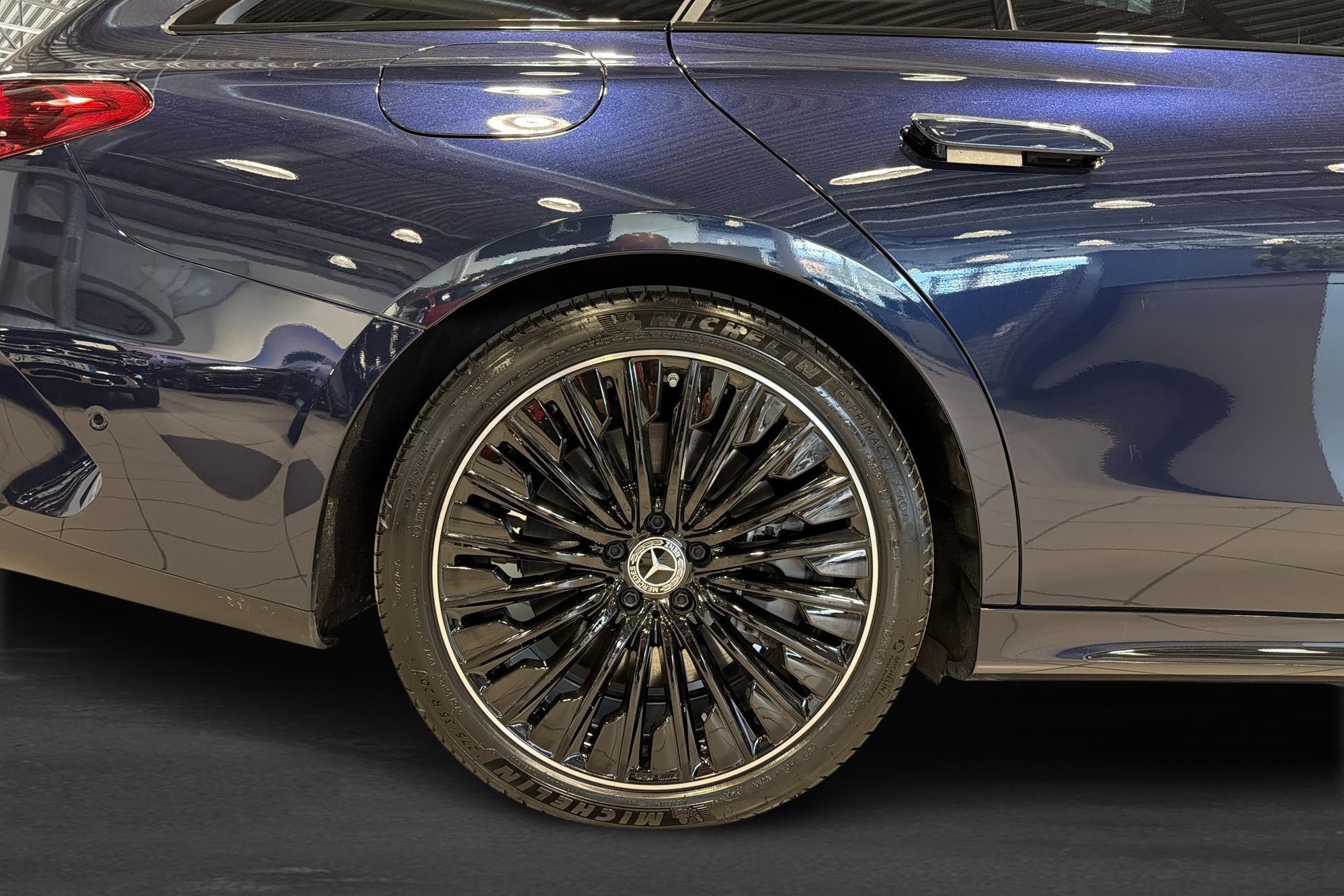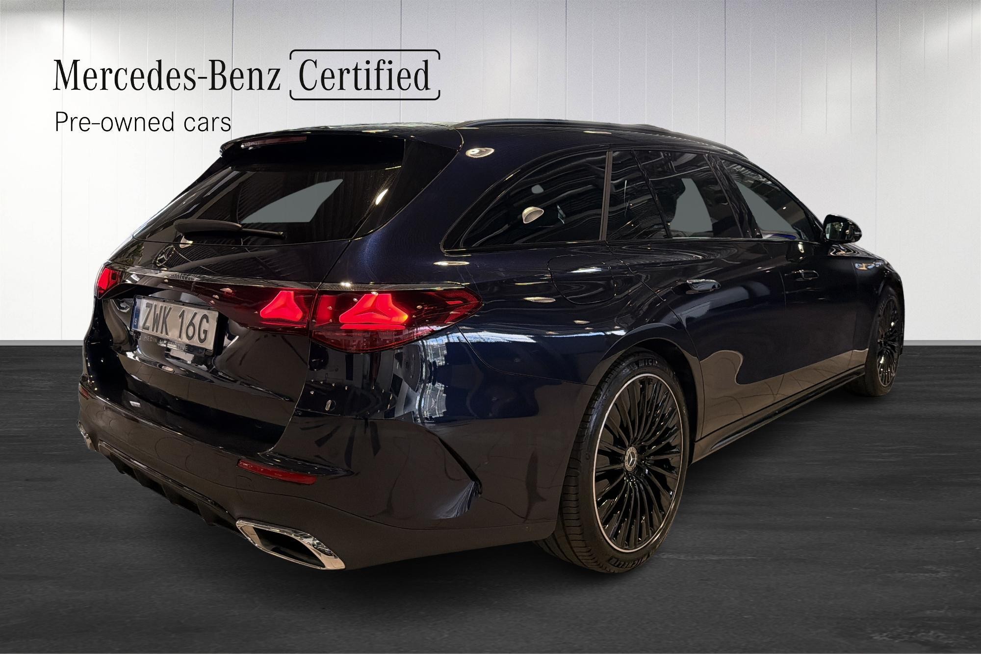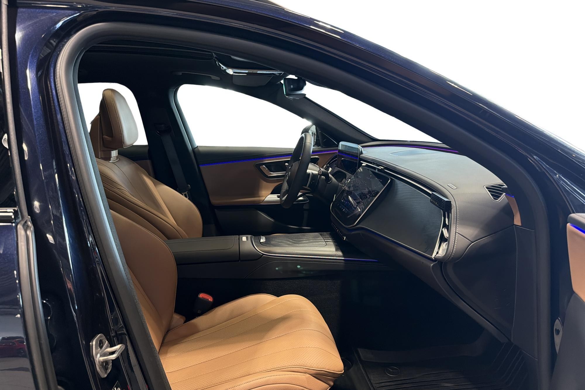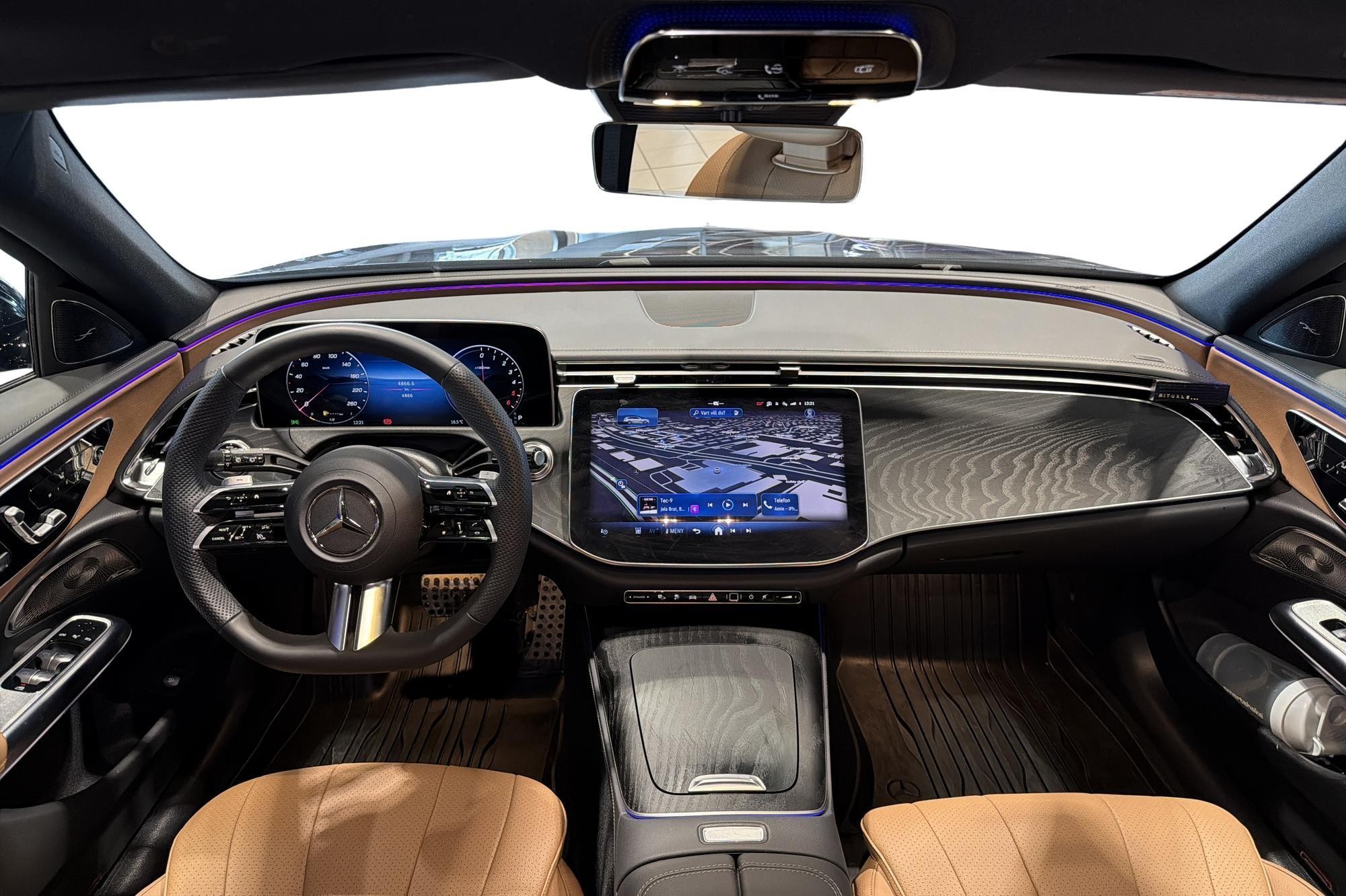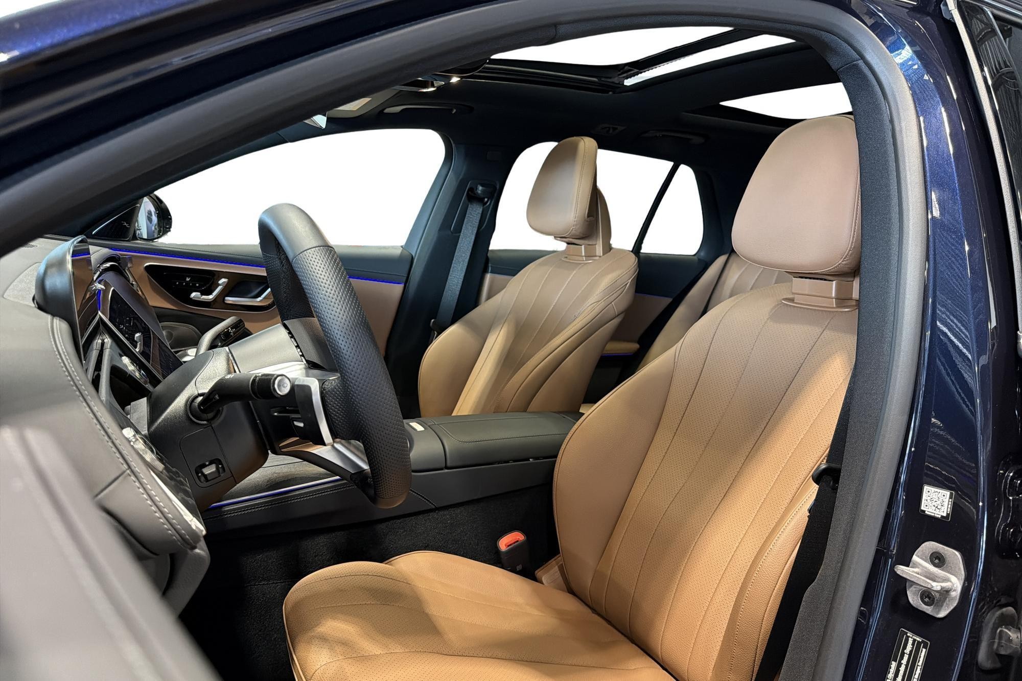 Bilen är en AMG Premium med Nauticblå metallic, AMG Line exteriör/interiör, Night Package, 20" AMG lättmetallfälgar och mörktonade rutor bak – en riktigt elegant och sportig kombi. Invändigt möts du av komfortstolar i Artico brun, multifunktionssportratt i nappa, minnespaket och 4-vägs svankstöd.