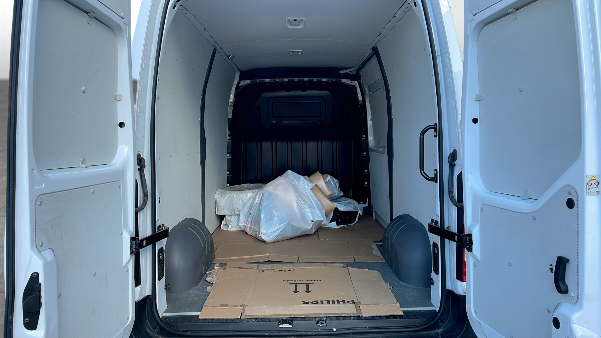 L2H2-karossen (ca 5,5 m lång, ca 2,5 m hög) ger ett rymligt skåp med bra lastvolym och hög lastvikt, samtidigt som bilen fortfarande är smidig i stadstrafik. Tre sittplatser fram gör att både förare och medåkare sitter bra.