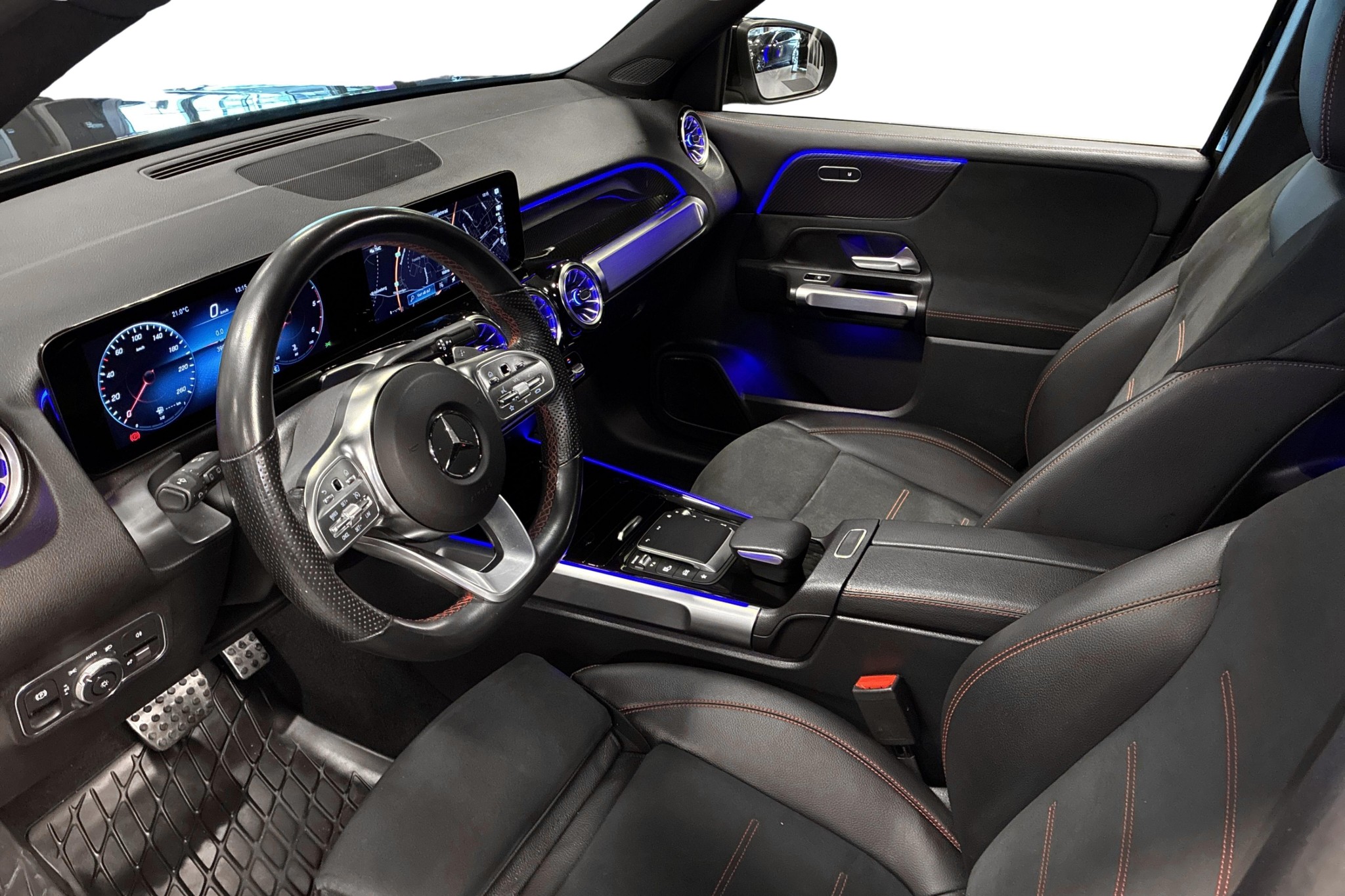 Utrustningen är generös: MBUX med hårddisksnavigation, digitalradio (DAB), centraldisplay, midline-ljudanläggning, KEYLESS-GO, backkamera, parkeringspaket med aktiv parkeringshjälp, elektrisk dragkrok och automatisk baklucka. Mörktonade rutor, takreling i kromlook samt 19" AMG-fälgar i dubbelekerdesign ger bilen ett riktigt skarpt yttre.