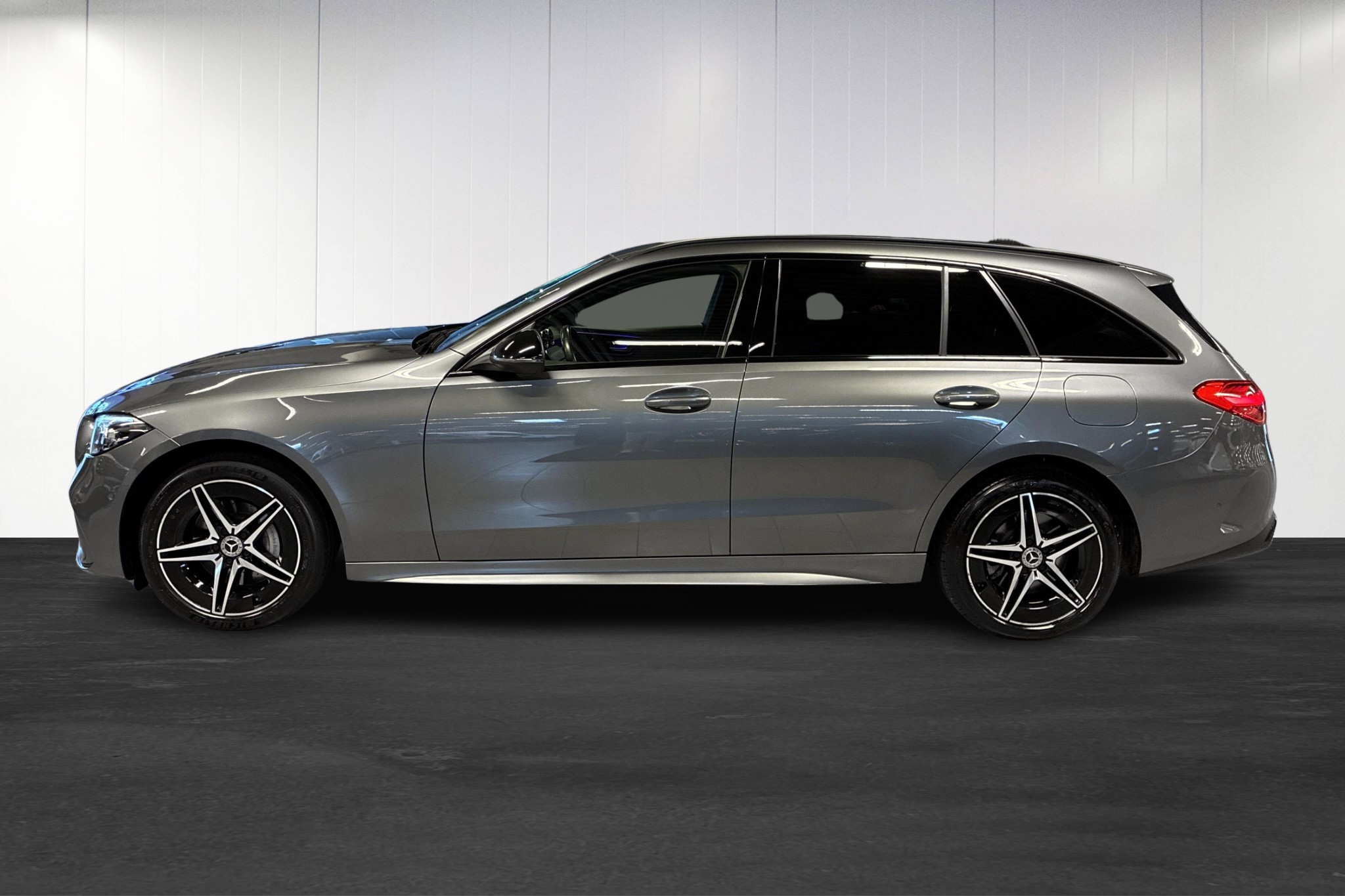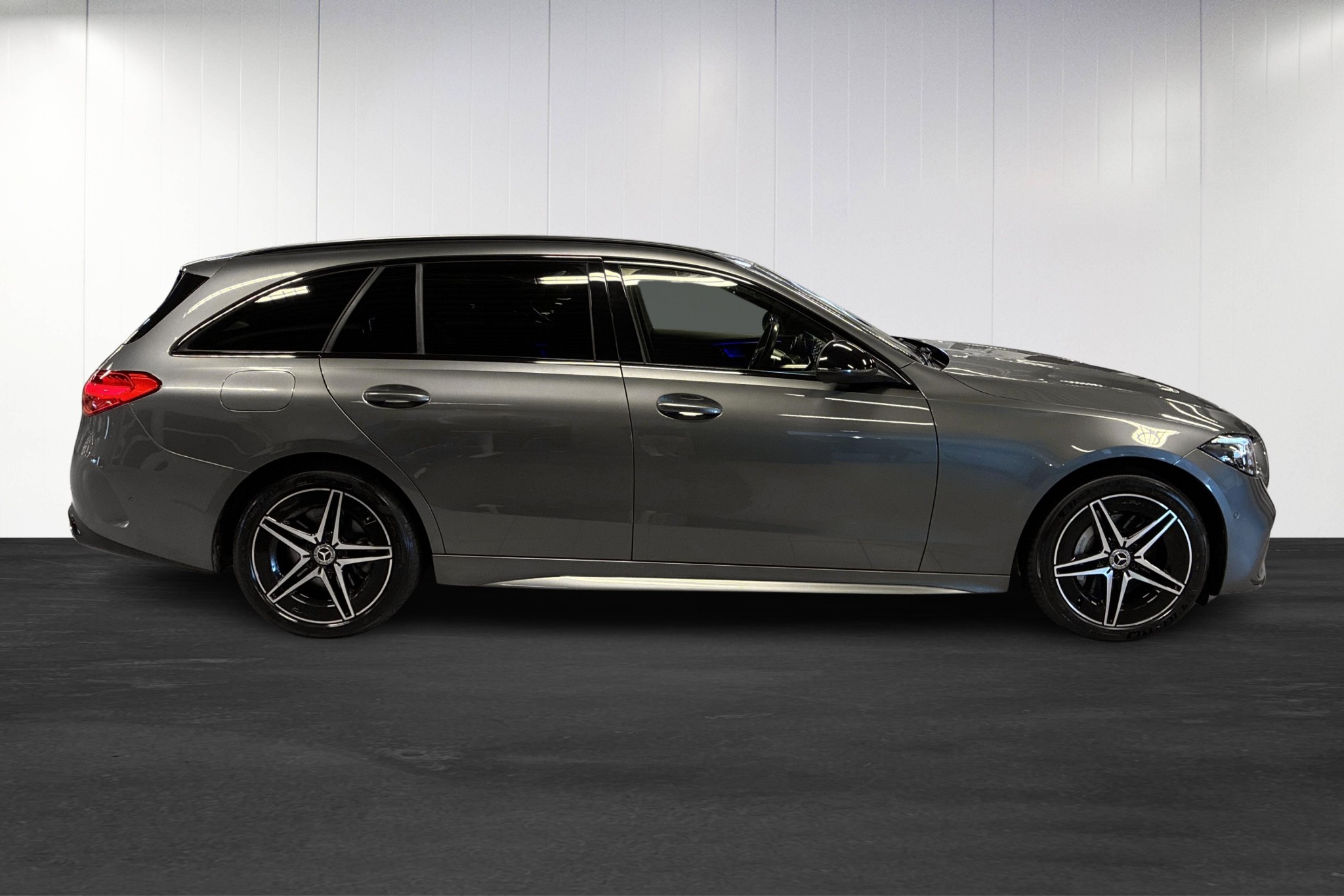 Stilren grå C-Klass kombi med kraftfull och effektiv plug-in-hybriddrivlina på 311 hk, automatlåda och framhjulsdrift. Upp till ca 11 mils elektrisk räckvidd (WLTP) gör att du kan köra mycket på el i vardagen men ändå ha bensinmotorns räckvidd på längre resor.