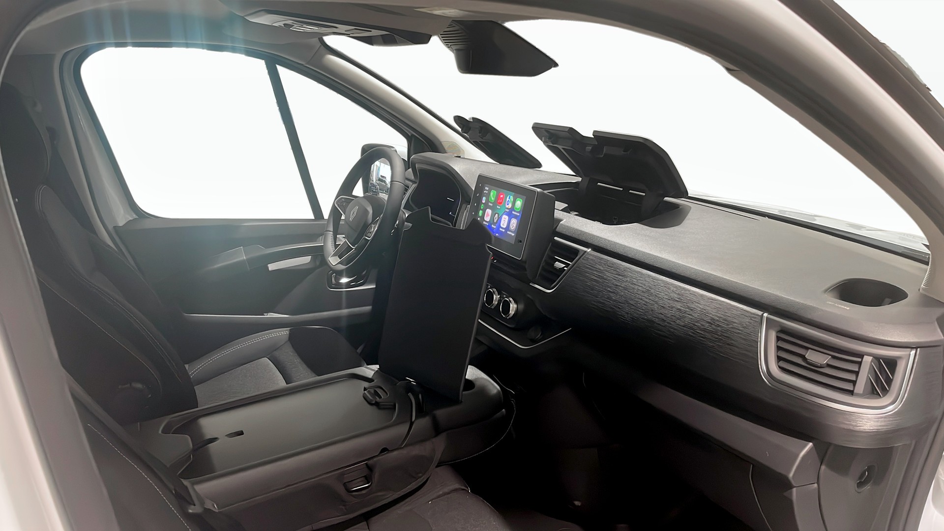 Invändigt sitter du bekvämt i 3-sits hytt med tygklädsel, sätesvärme fram, farthållare/fartbegränsare, färddator och digital hastighetsmätare. Den moderna pekskärmen erbjuder Apple CarPlay/Android Auto, Bluetooth (handsfree), GPS, röststyrning, USB-uttag och trådlös telefonladdare – idealiskt för en effektiv arbetsdag.