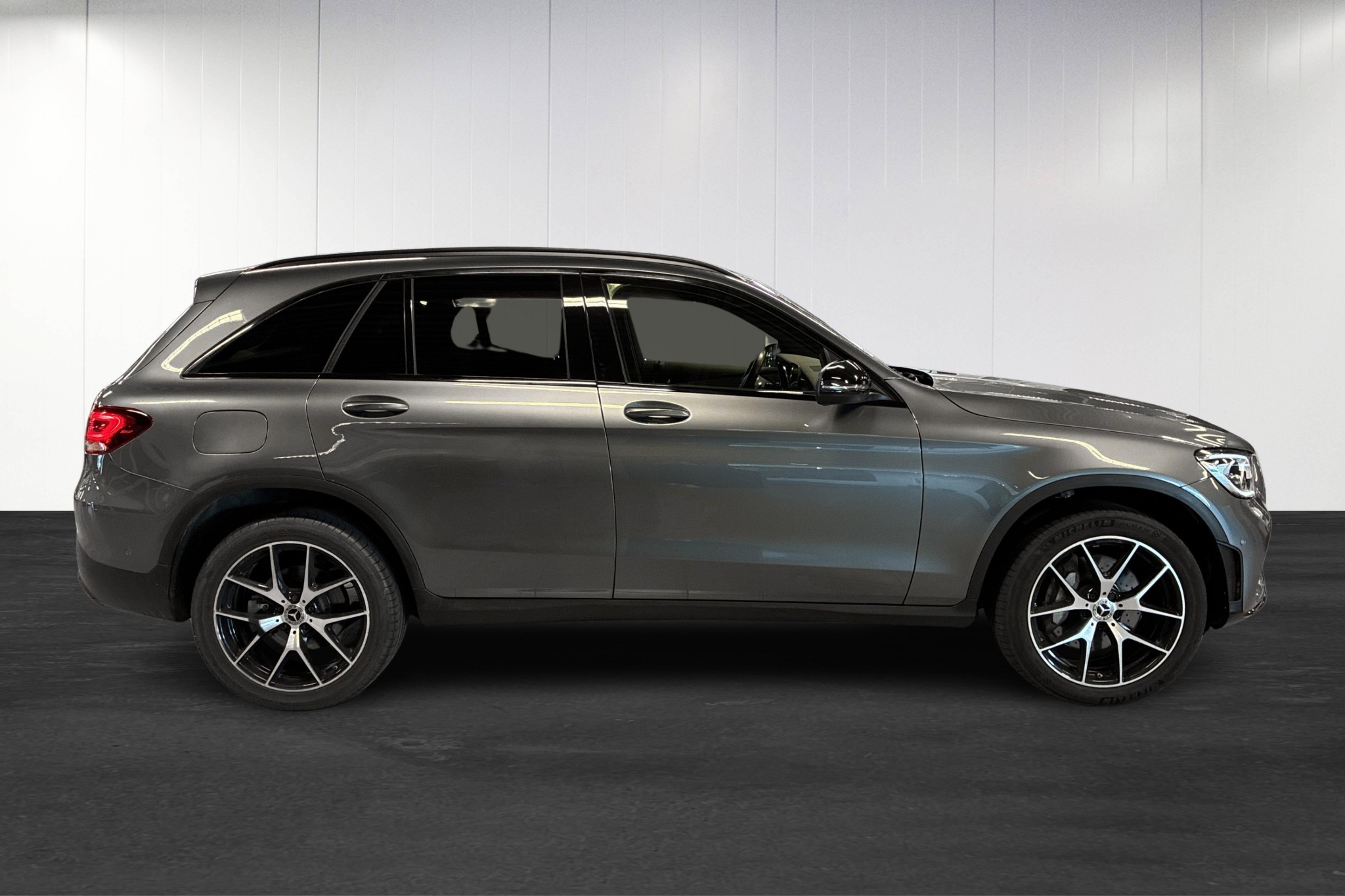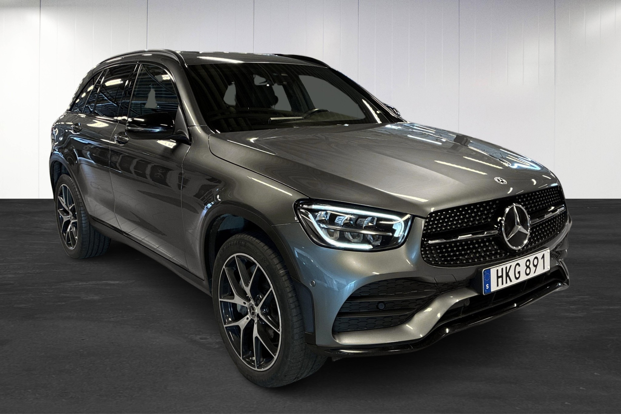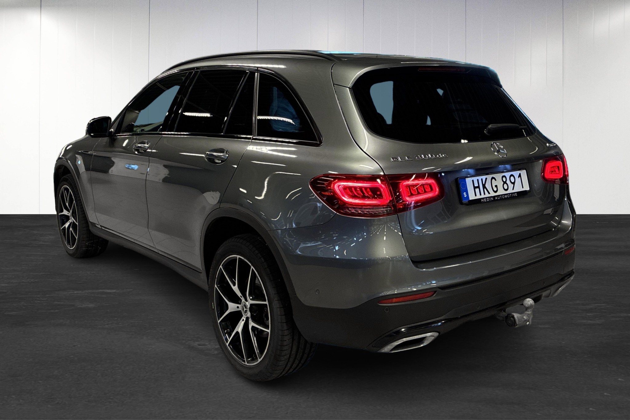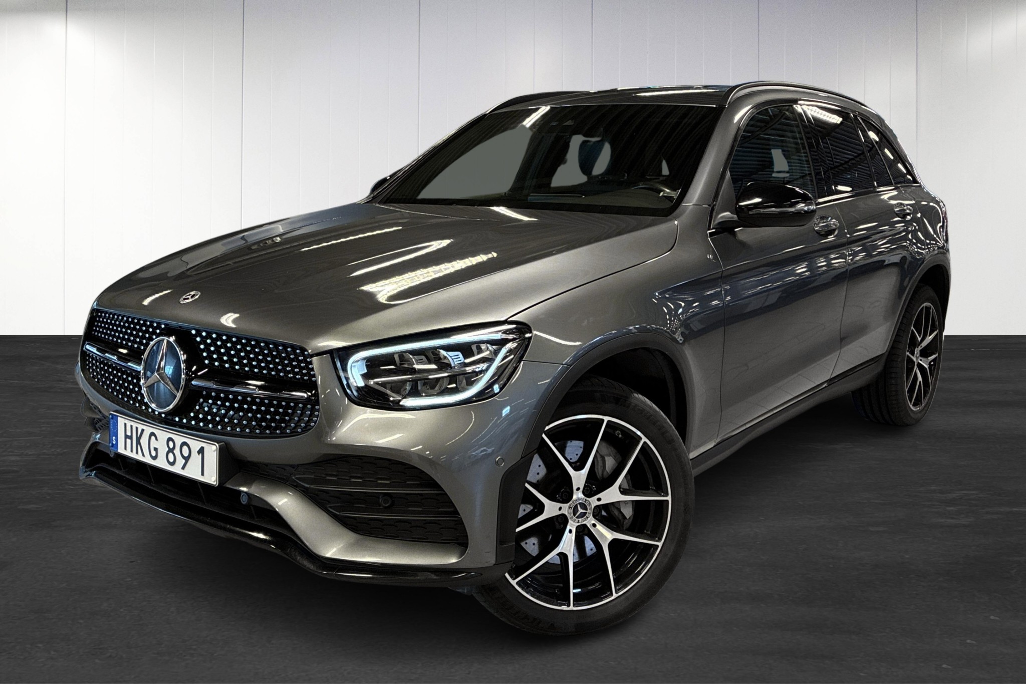 Mercedes-Benz GLC 300 de 4MATIC Plug-in Hybrid, 2022, i elegant selenitgrå metallic – en sportigt utrustad och samtidigt bränslesnål SUV med bara ca 7788 mil på mätaren.