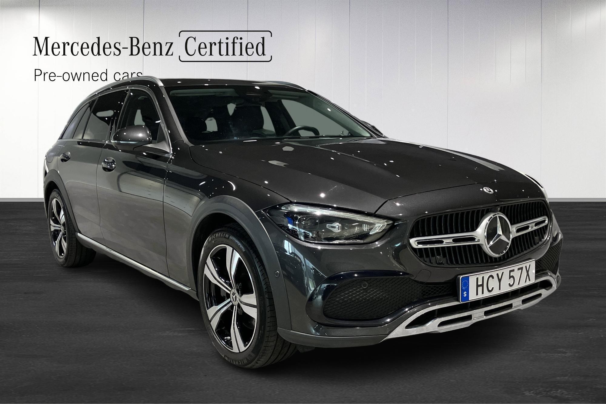 Mercedes-Benz C 220d 4MATIC All-Terrain, årsmodell 2024, i elegant grafitgrå metallic – en nästan ny bil med endast ca 3770 mil på mätaren. Svensksåld, första registrering 2024-03-22.