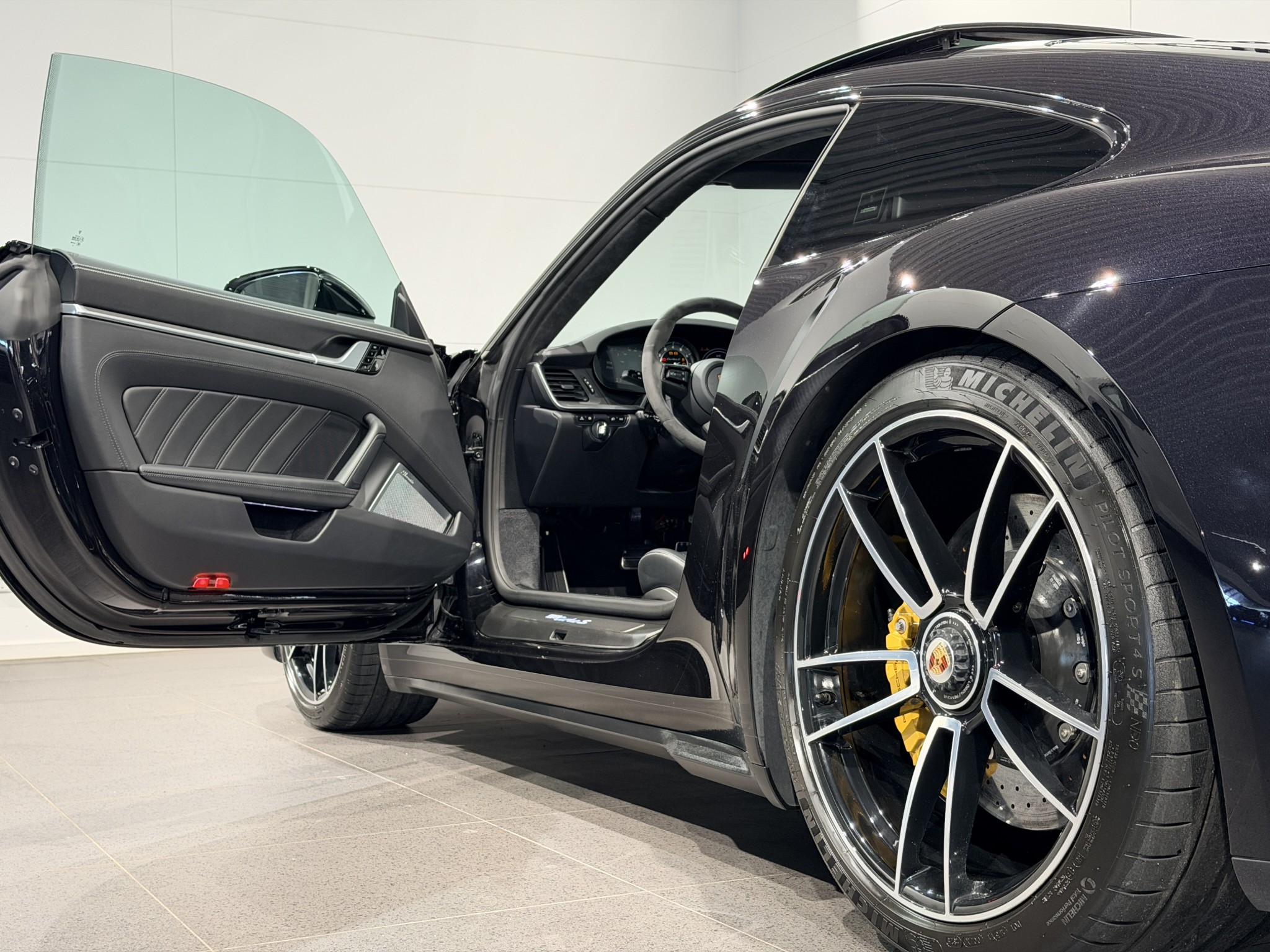 Den svarta färgsättningen tillsammans med detaljer som Exclusive Design-bakljus, tonade rutor och sportavgasrör i högglanssvart ger bilen ett mycket elegant och samtidigt aggressivt uttryck. En svårslagen 911 Turbo S för dig som vill ha en bil med både vardagsanvändbarhet och ren supersportbilskaraktär.