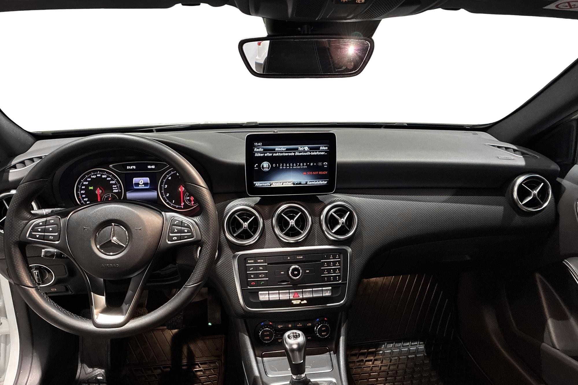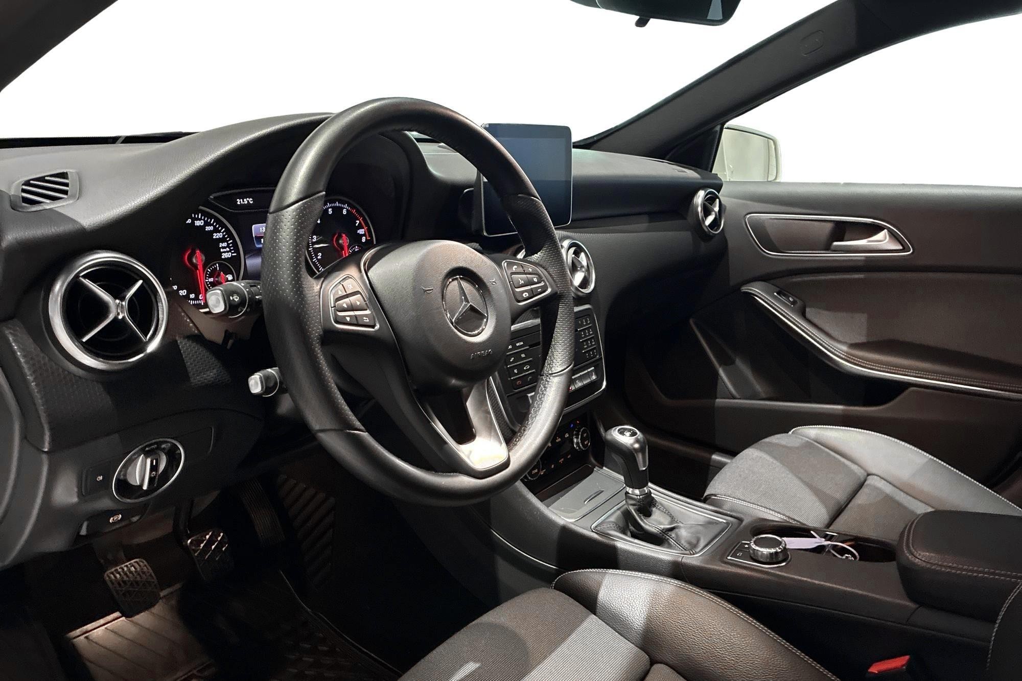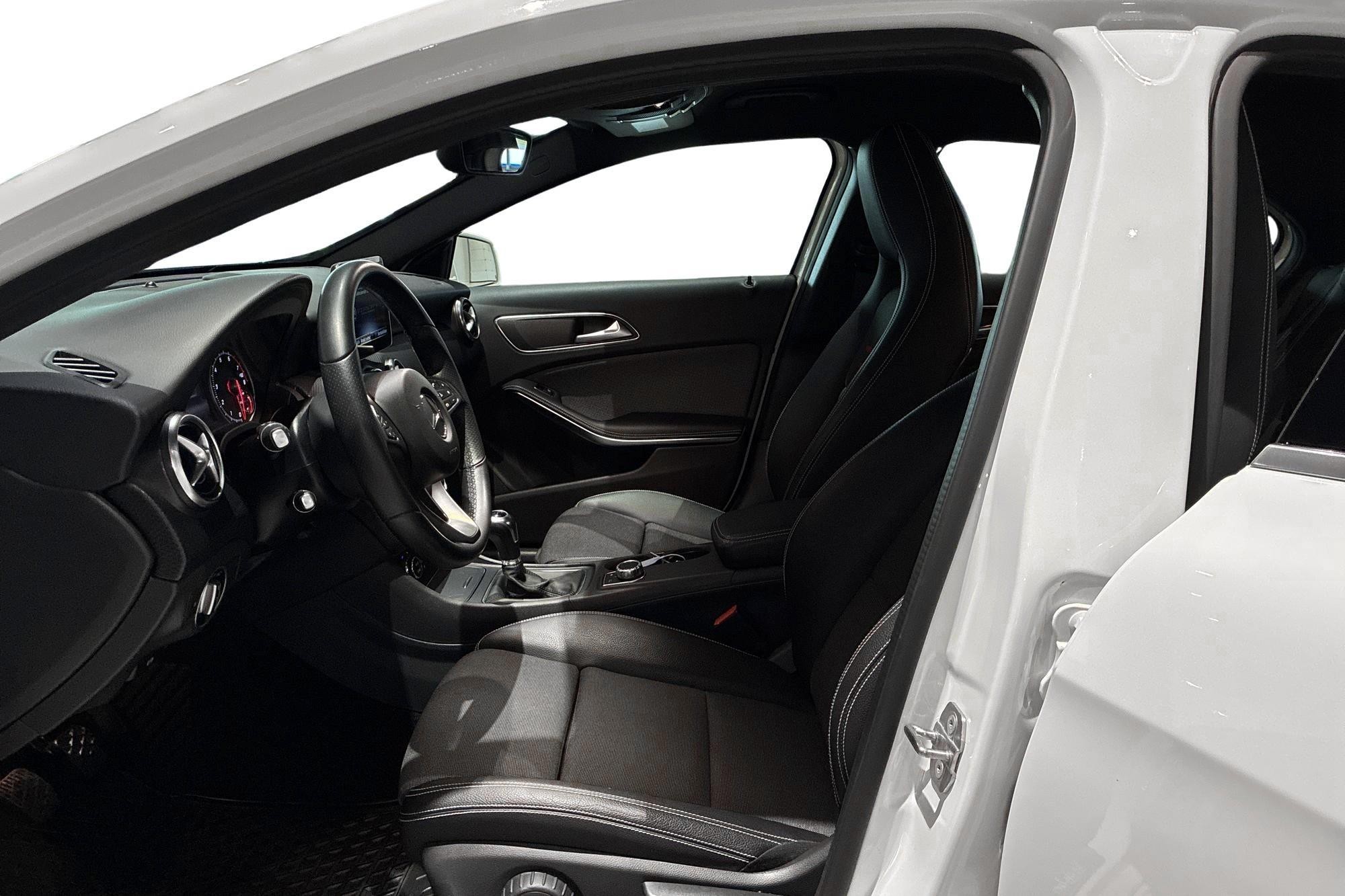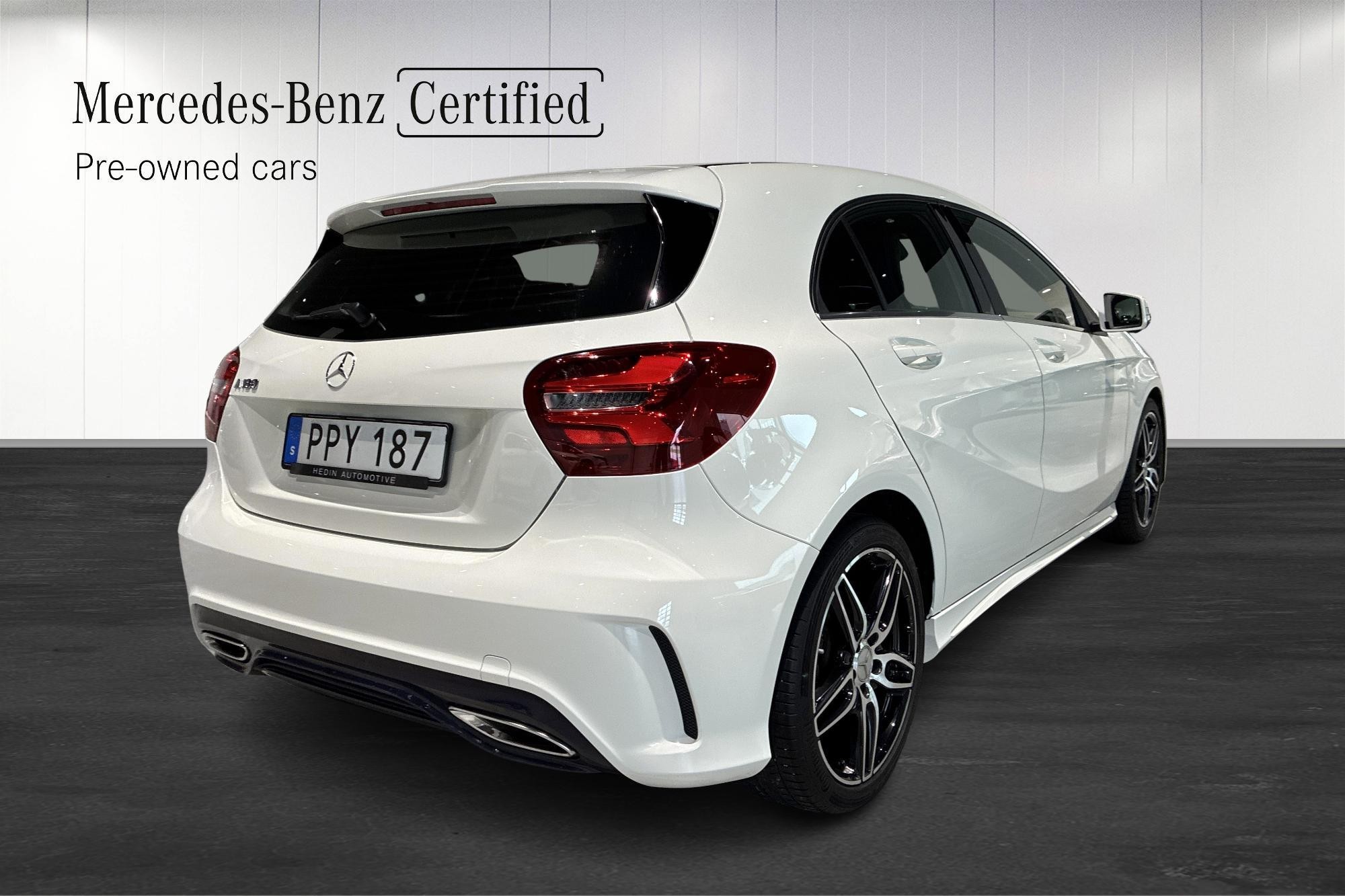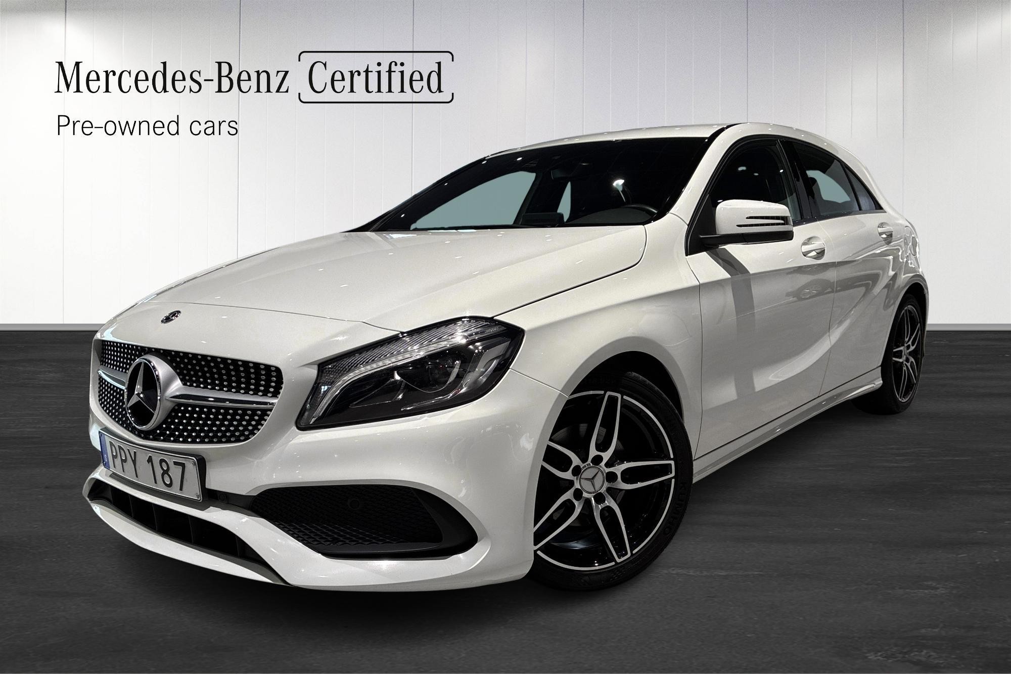 Mercedes-Benz A 180 AMG Style Backkamera, årsmodell 2018, i stilren vit kulör. En snygg och praktisk halvkombi med sportig AMG-design, manuell växellåda och bensinmotor på 122 hk.