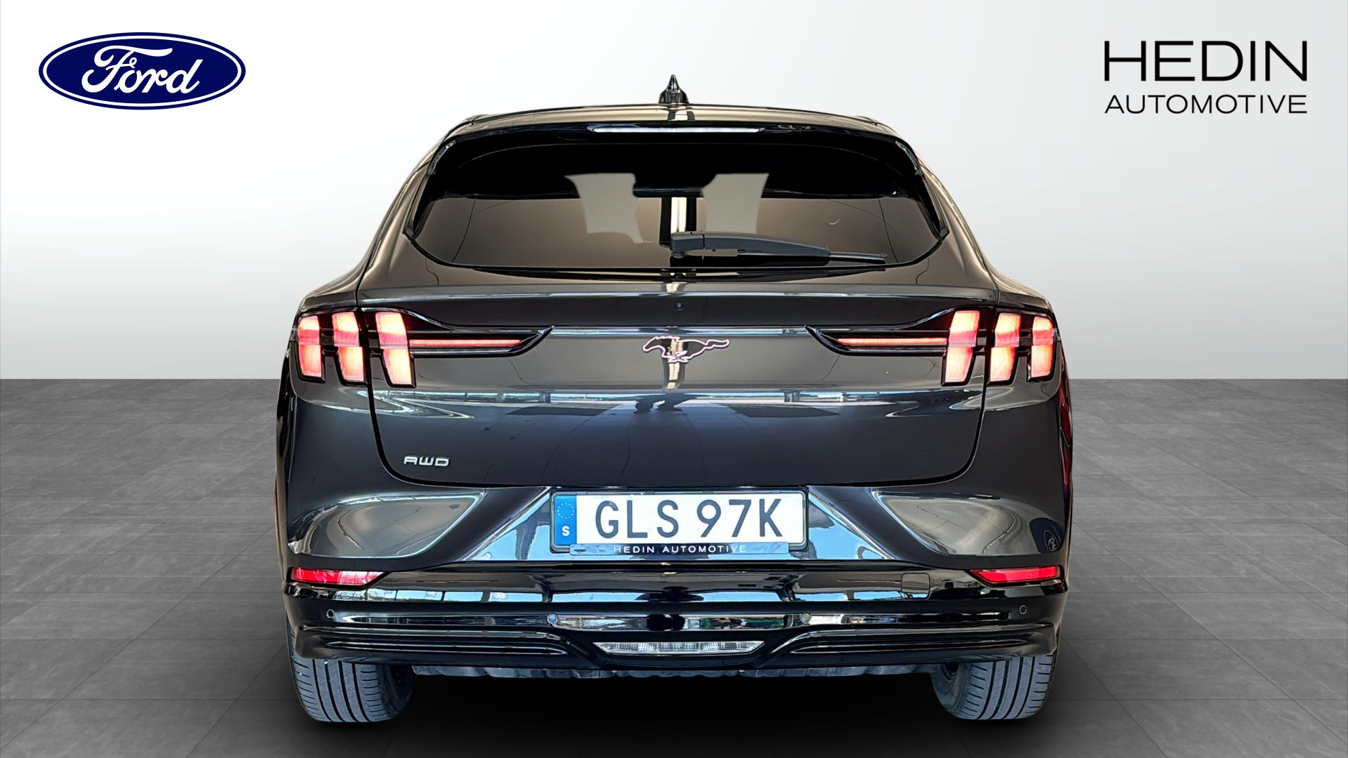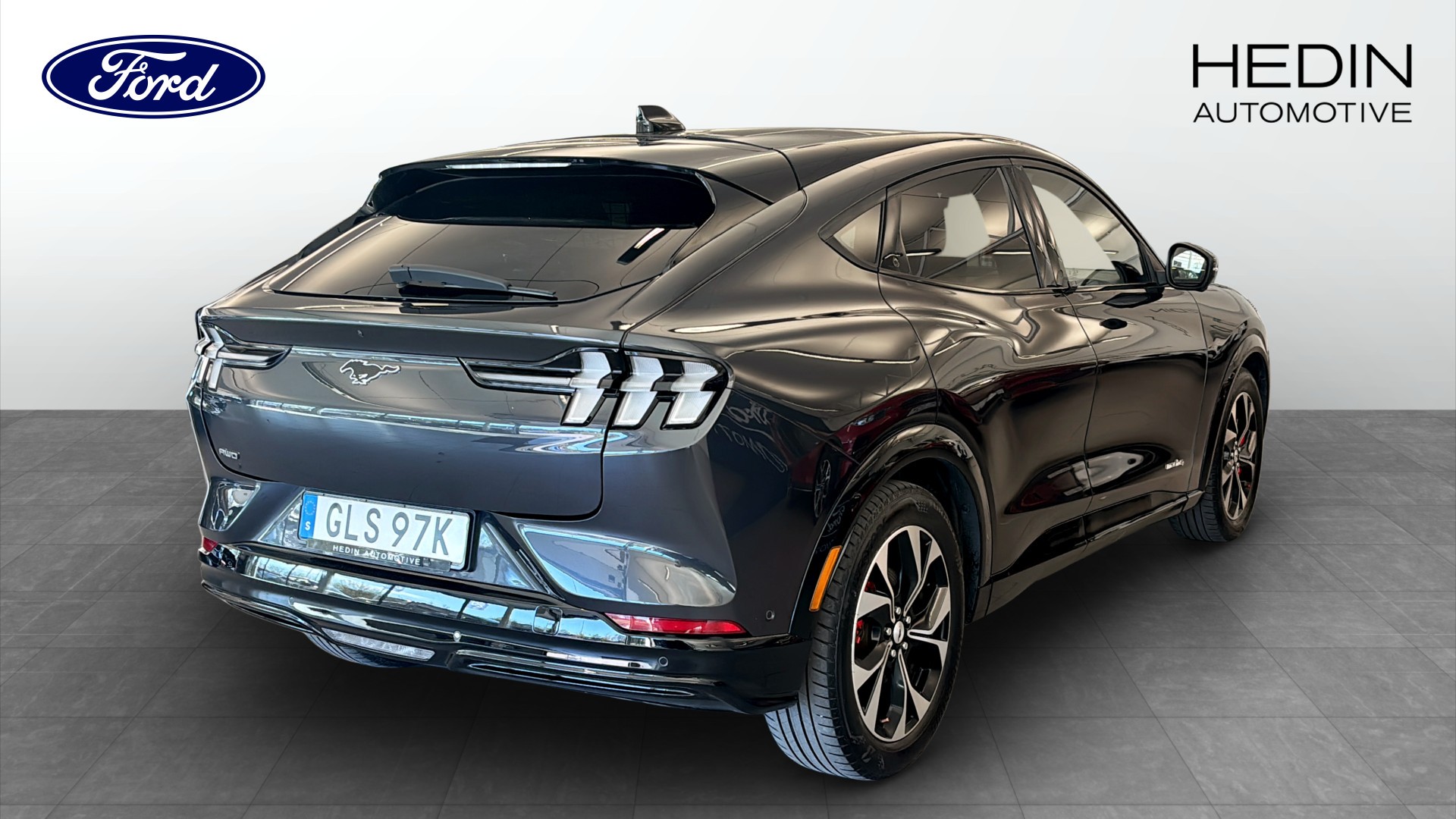 Ford Mustang Mach-E AWD SR AUT i stilren grå kulör – en helelektrisk SUV/crossover som kombinerar sportig känsla med hög komfort och smart teknik.