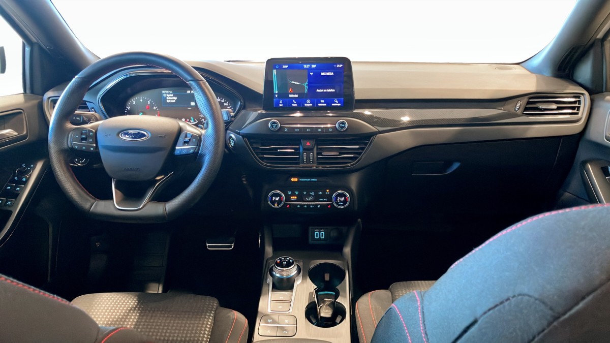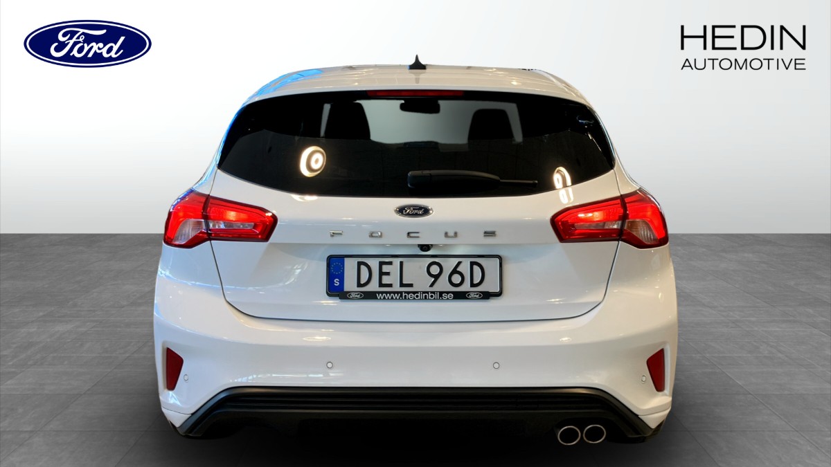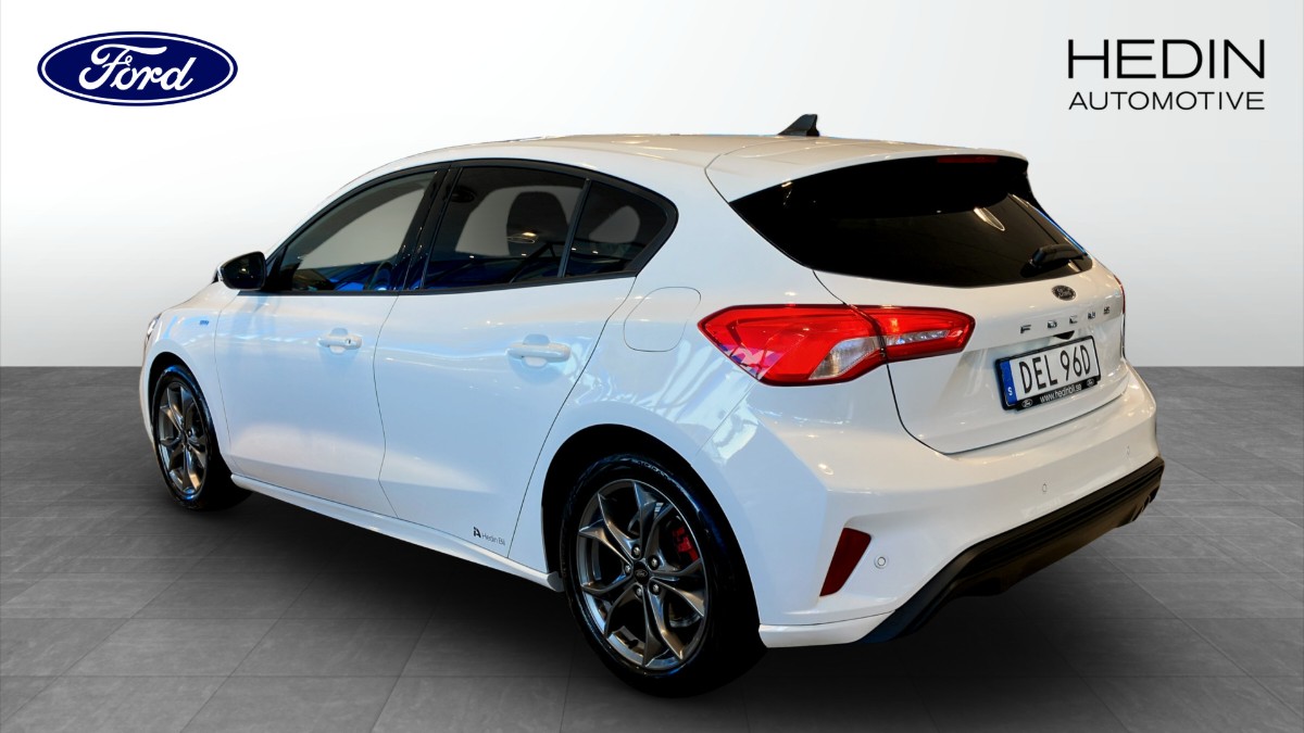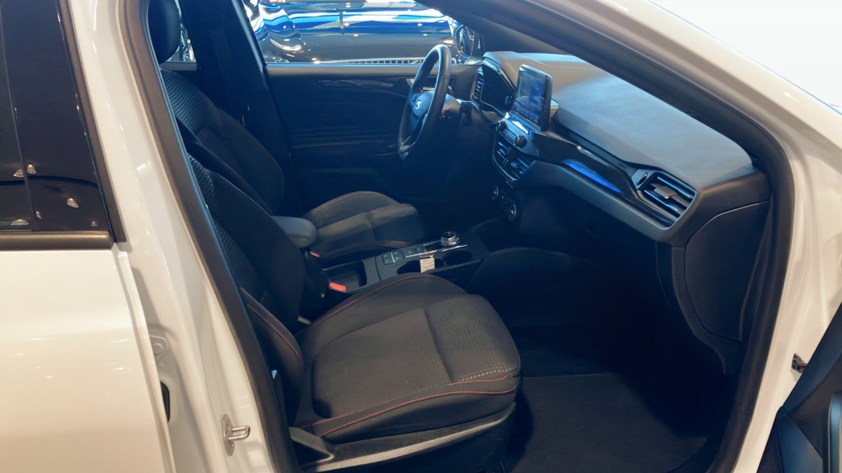 Ford Focus 1.0 EcoBoost 125hk ST-Line Automat, 2022, i stilsäker färgen Frozen White och med endast 4000 mil på mätaren – en nästan ny bil med sportig känsla och låg förbrukning.