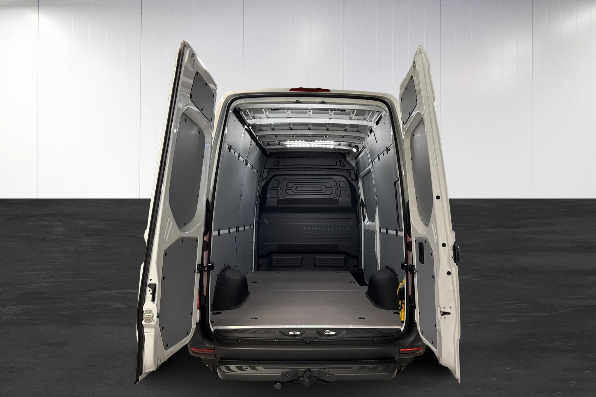 Den här vita skåpbilen har högt tak, lång hjulbas (3665 mm) och praktiskt trägolv i lastutrymmet, LED-belysning i skåpet, dubbla bakdörrar 270° samt skjutdörr på höger sida – perfekt för effektiv lastning i trånga miljöer. Släpvagnskoppling med fast kula och 13-polig kontakt ger dessutom extra flexibilitet i jobbet.