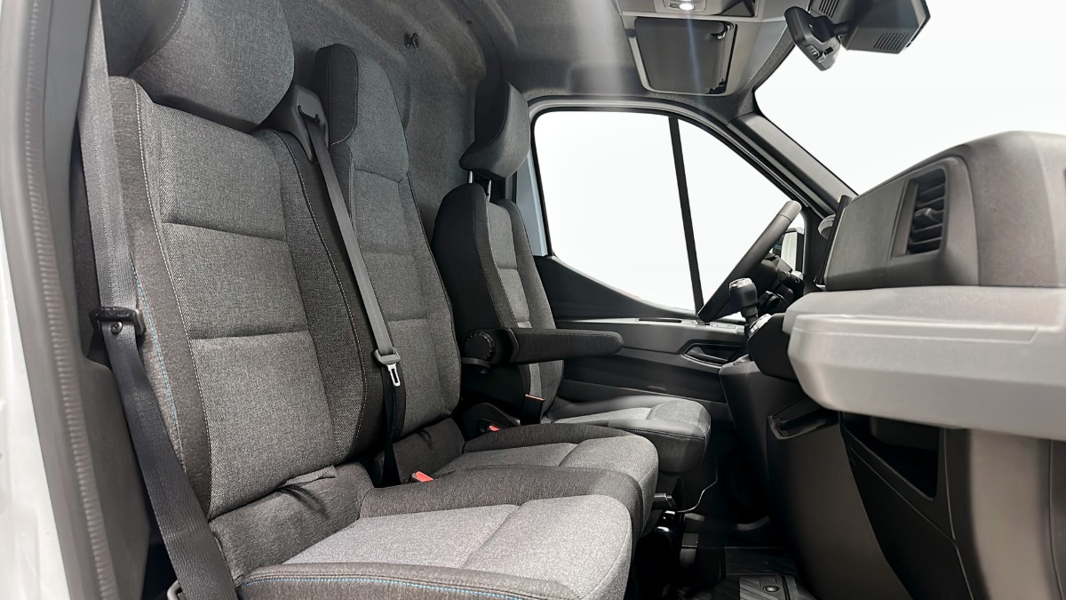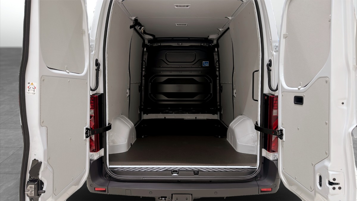 Bilen har en robust och modern design i Mineral Vit med flexibla lastlösningar, inklusive ett rymligt lastutrymme, trägolv och vänster sidoskjutdörr. De 270° öppningsbara bakdörrarna gör lastning och lossning både enkel och smidig.