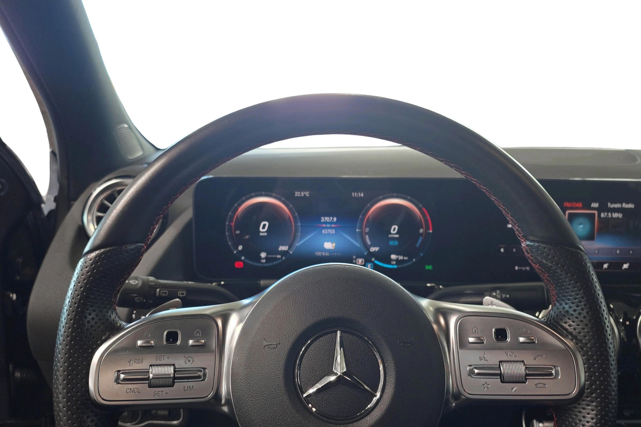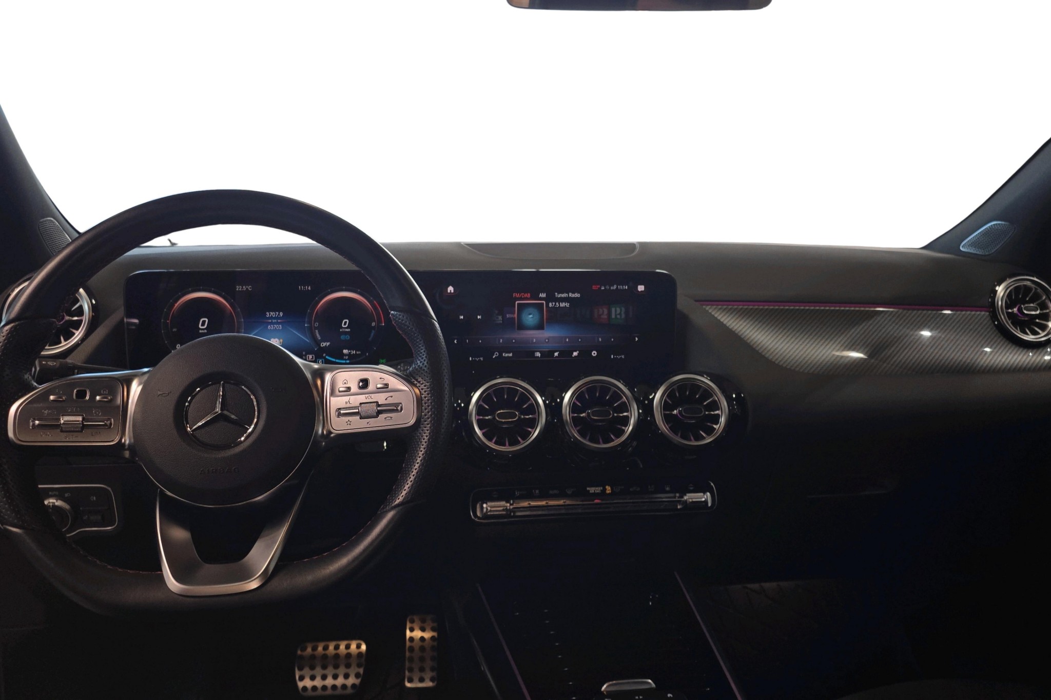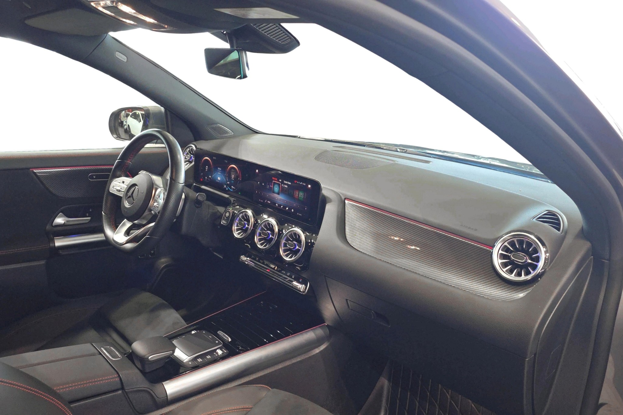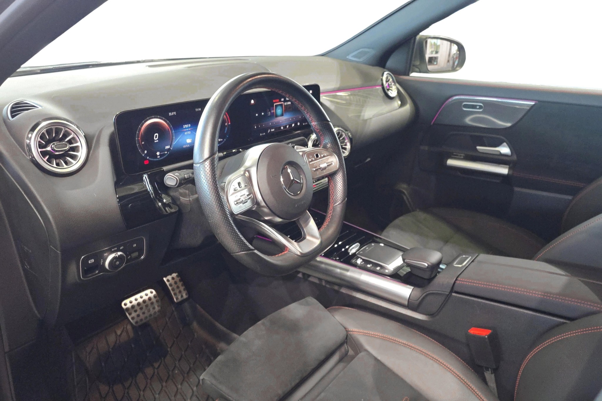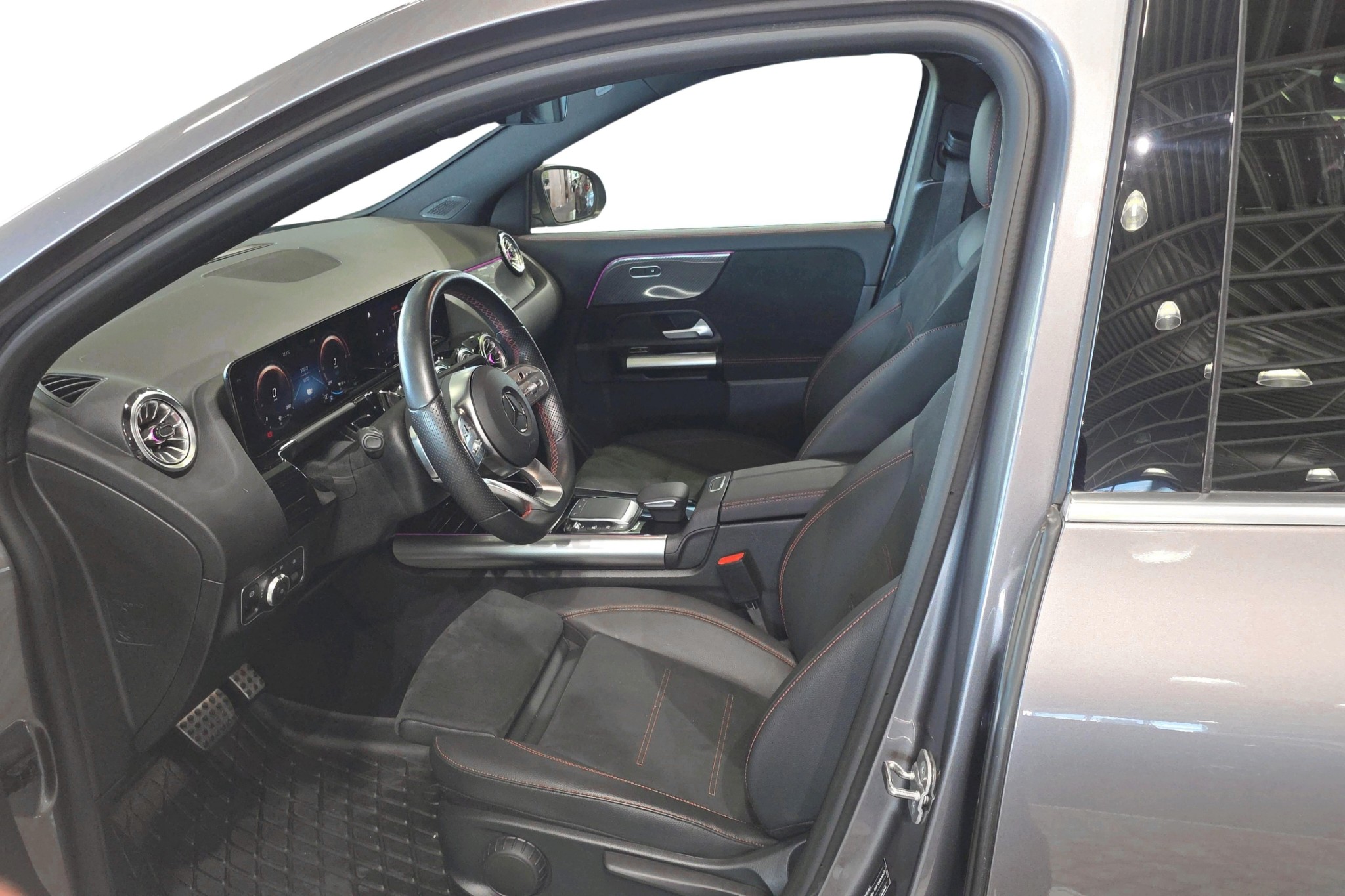 Denna modell är utrustad med AMG Line-paketet, som ger en sportig design både utvändigt och invändigt. Interiören skämmer bort dig med konstläderklädsel i Artico/mikrofiber, svart innertak och en kolfiberoptik på interiörpanelen. Komforten ökar med funktioner som eluppvärmda framstolar, en stor 10,25-tums förardisplay och en automatisk klimatanläggning.