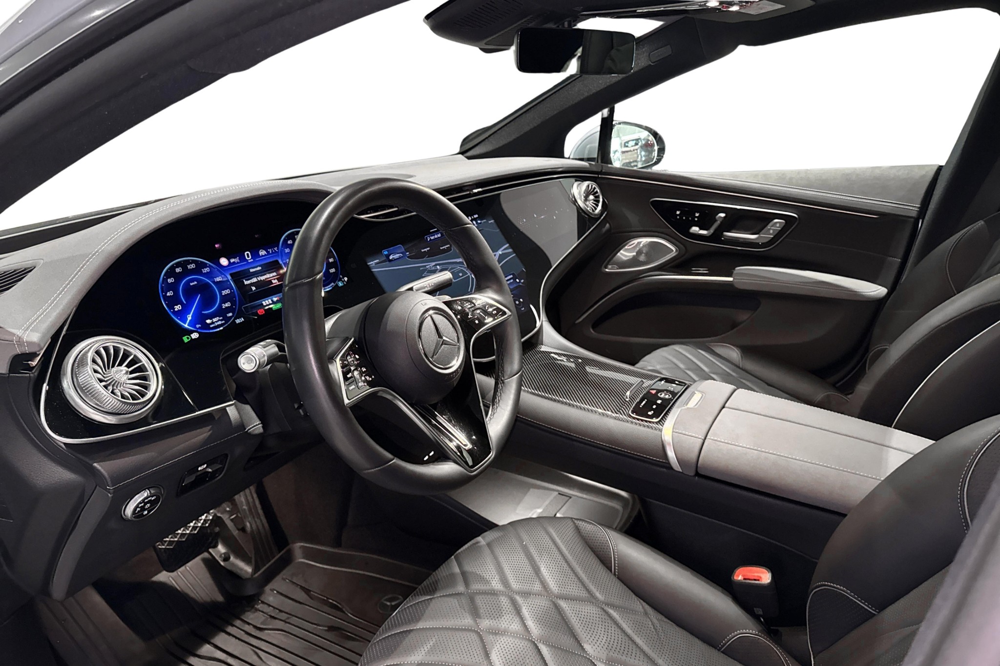 Med fyra hjulsdrift och en imponerande effekt på 385 kW (523 hk), accelererar den från 0 till 100 km/h på endast 4,3 sekunder. Den har dessutom en WLTP-räckvidd på upp till 642 km, vilket gör den idealisk för både vardag och långa resor. Utrustad med en hyperscreen-panel, adaptive farthållare och Burmester 3D surroundljudsystem ger denna bil en högteknologisk körupplevelse.
