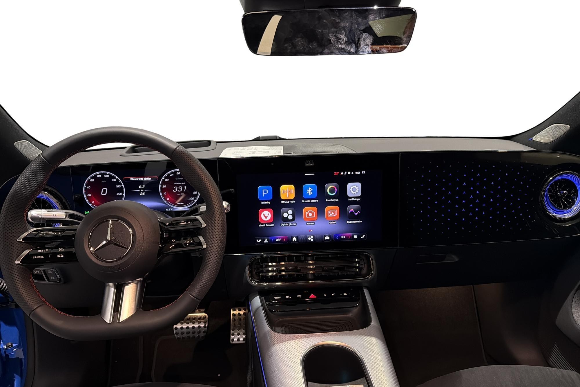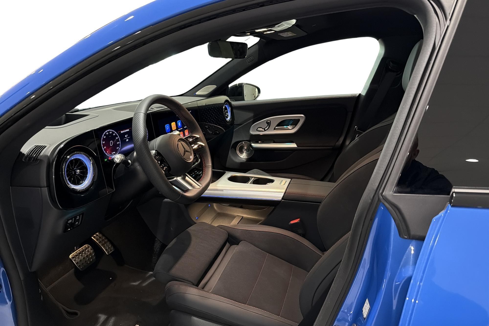 Här har vi en imponerande Mercedes AMG CLA 250+ Advanced Edition från modellår 2025. Den rör sig framåt med rena linjer och en elektrisk drivlina som erbjuder upp till 725 km räckvidd enligt WLTP. Den snyggt lackerade blåa karossen ger bilen en exklusiv look som drar blickarna till sig.