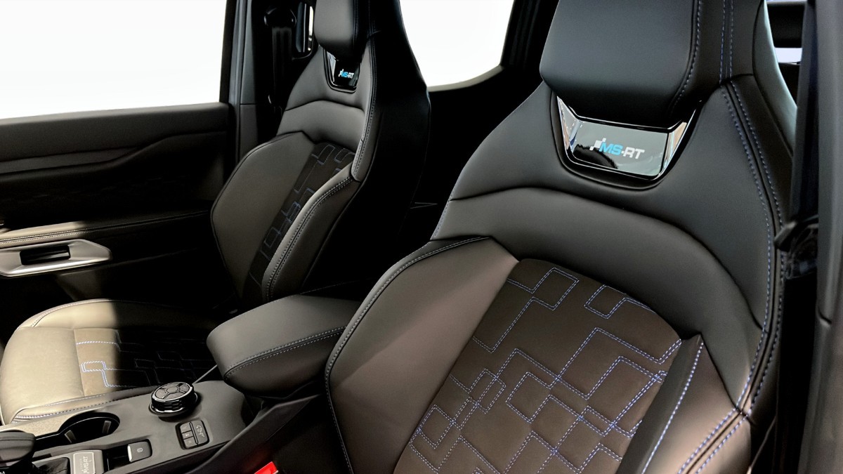 Interiören förhöjs av 8-vägs eljusterbart förarsäte, sportstolar och exklusiva MS-RT-detaljer som golvmattor och läderratt med värmefunktion. Med plats för fem passagerare och en rad smarta funktioner som en 12-tums pekskärm, Apple CarPlay, Android Auto, adaptiv farthållare, backkamera och parkeringssensorer, får du en komfortabel och säker körupplevelse, och inte minst en riktigt sportig pick-up.