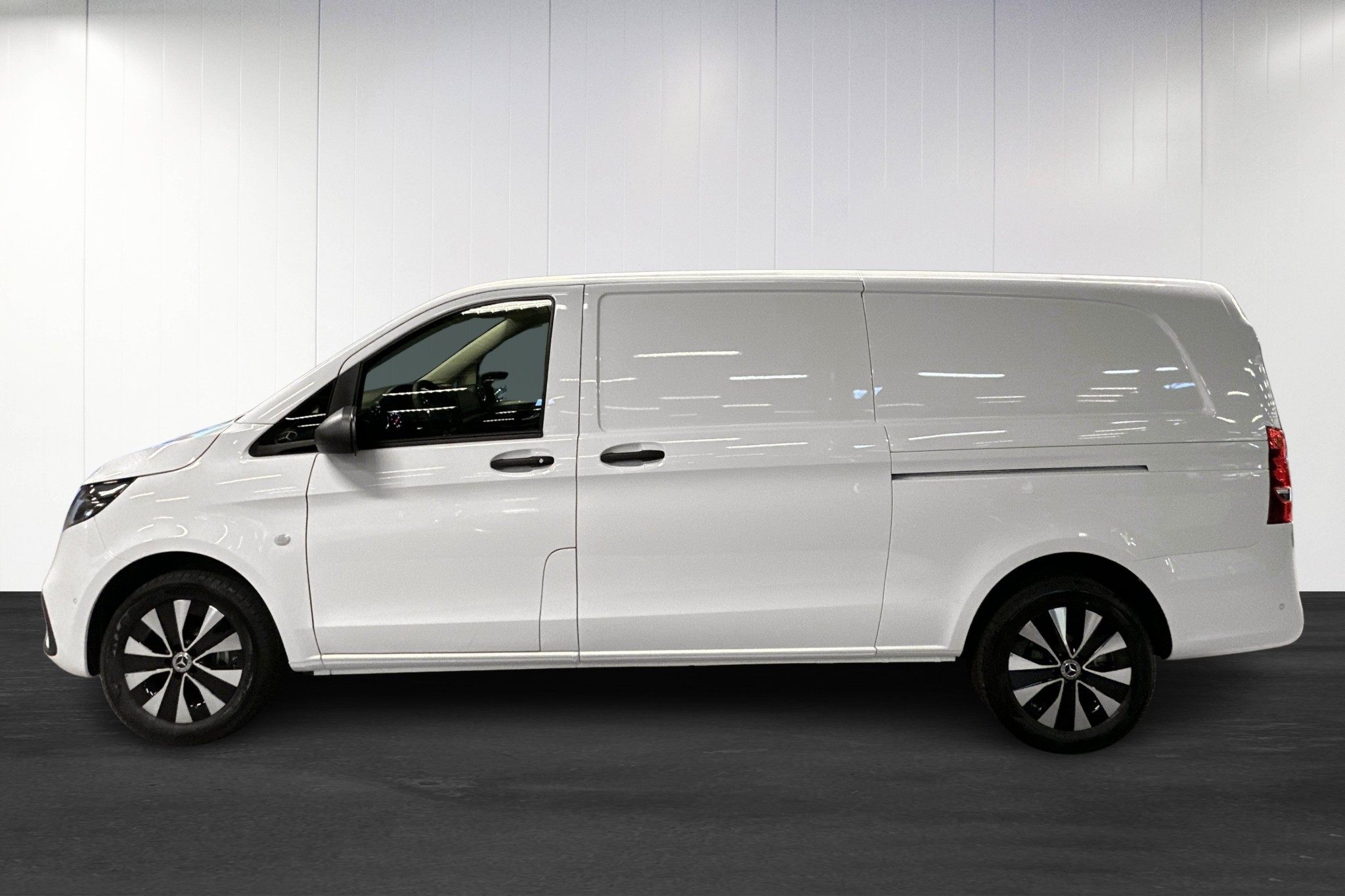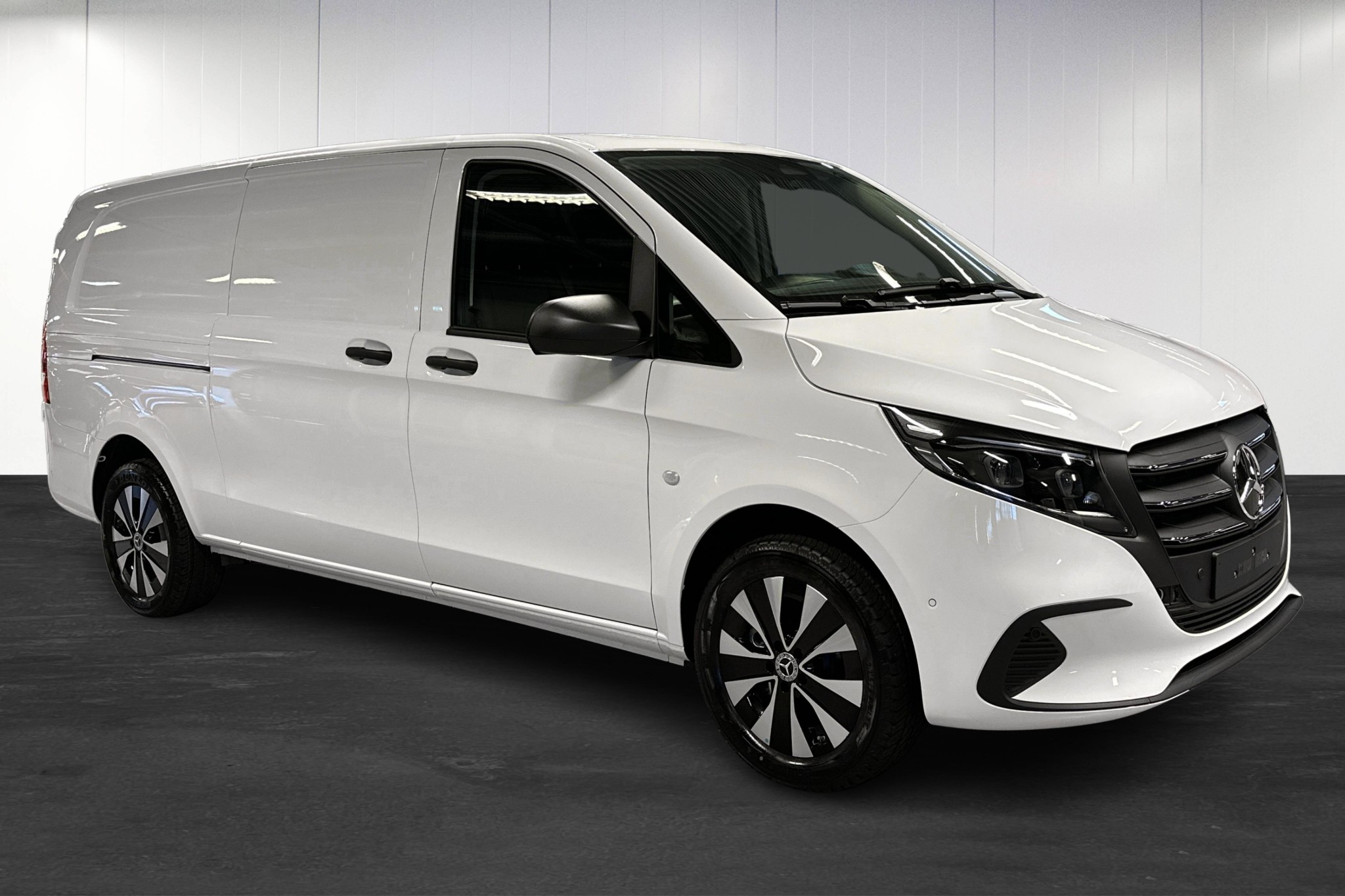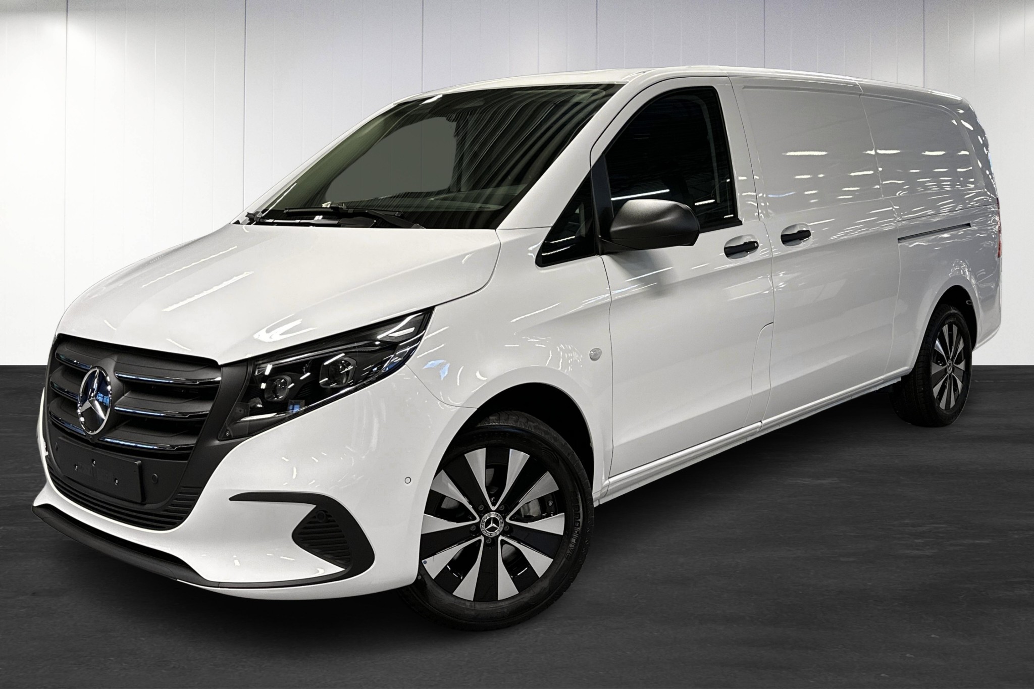Den extra långa modellen erbjuder generös lastkapacitet och en maximal lastvikt på upp till 3200 kg, vilket gör den idealisk för företag eller större transporter. Förarutrymmet har svart konstläderklädsel, uppvärmd multifunktionsratt i läder och det moderna MBUX multimediapaketet med navigation.