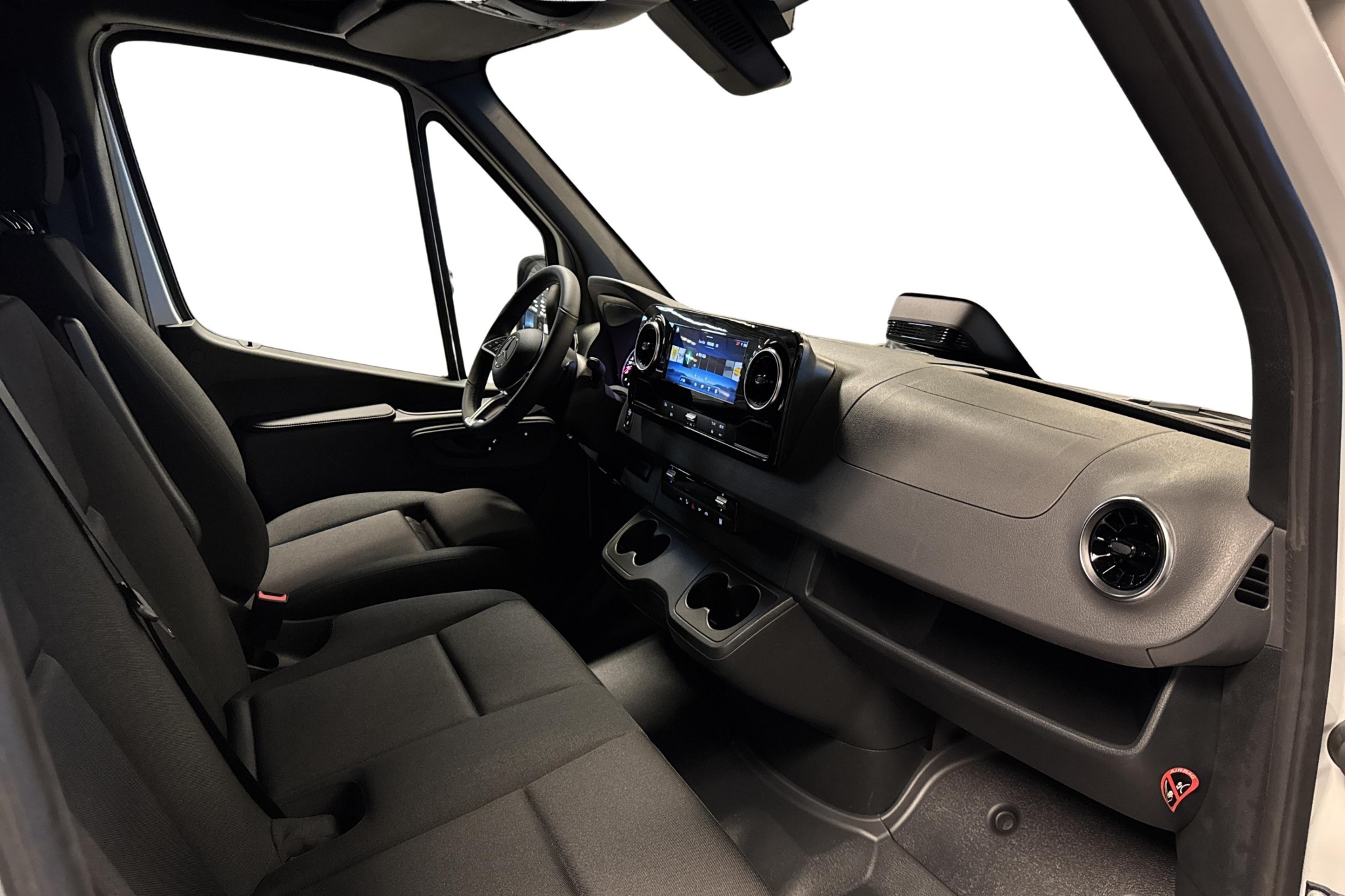 Förarplatsen bjuder på fjädrande komfortsäte med armstöd, läderratt, multifunktionsratt, MBUX multimediasystem med smartphone-integration, digitalradio (DAB) och färgdisplay i instrumentklustret. Kupévärmare med tidur, vinterpaket, eluppvärmda stolar och värmedämpande glas ger bra komfort året runt.