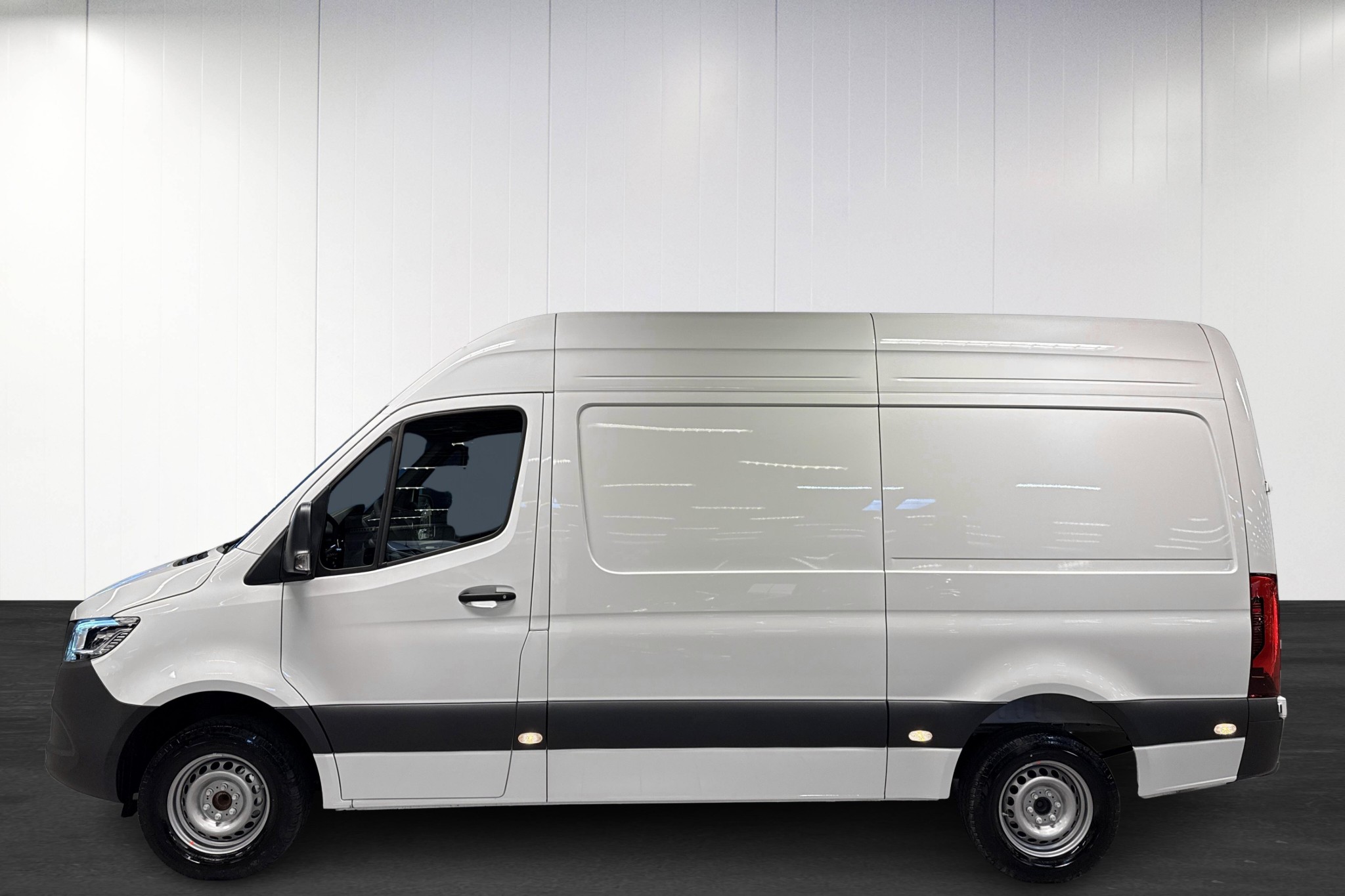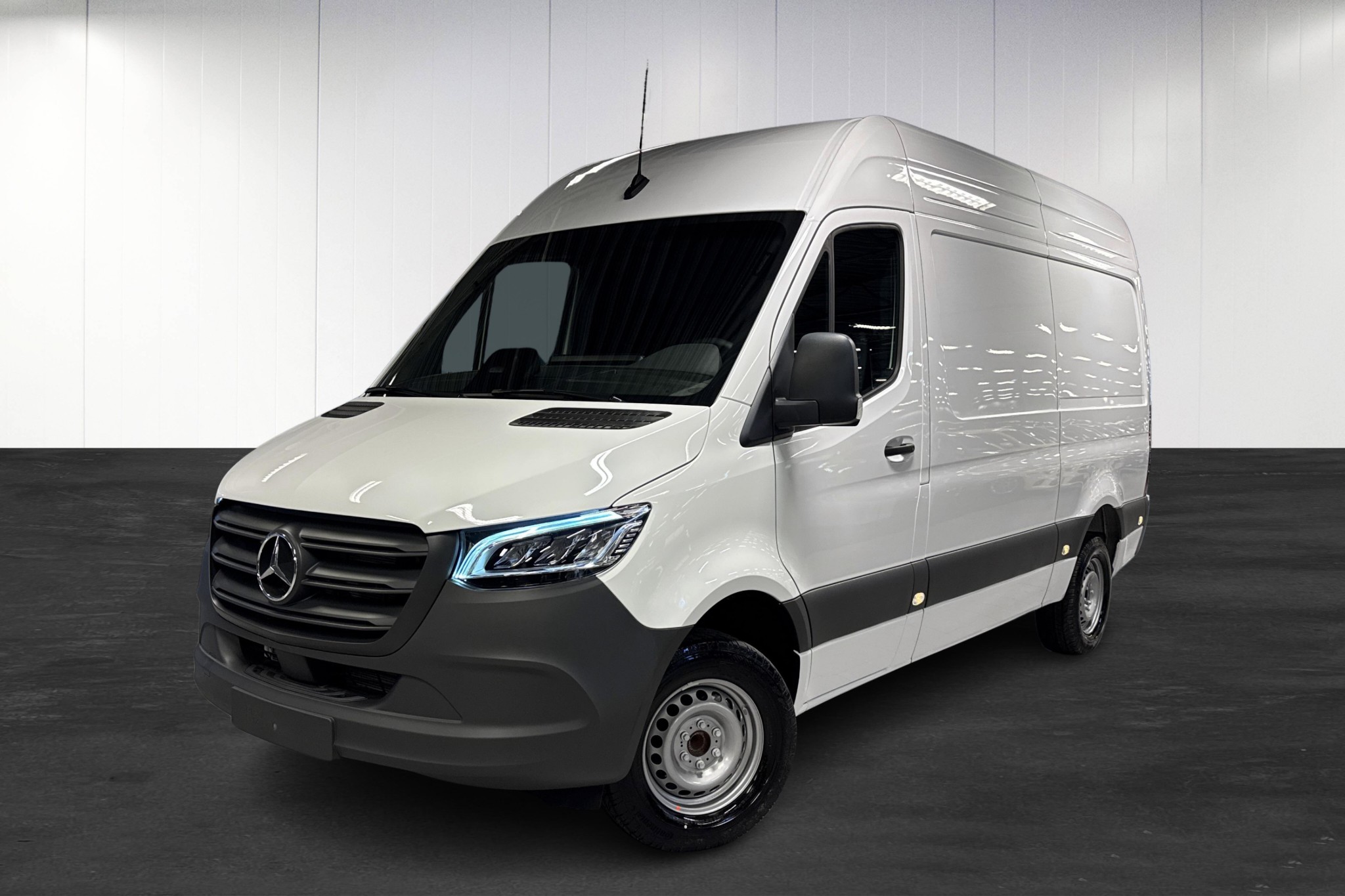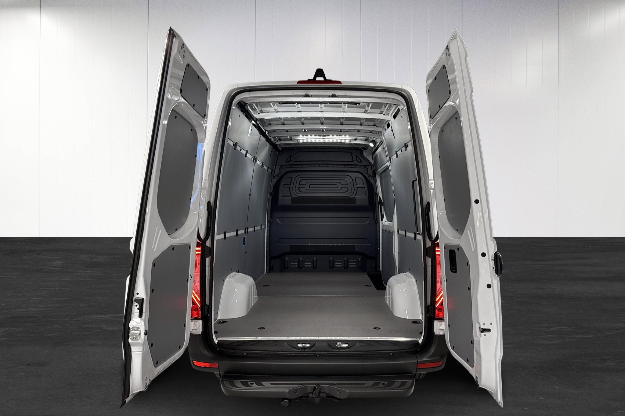 Under huven sitter en stark och effektiv 170 hk dieselmotor med 9G-Tronic automat och bakhjulsdrift, HVO-kompatibel och med stor 93-liters tank för bra räckvidd. Högt tak, lång hjulbas och trägolv i skåpet ger ett praktiskt och slitstarkt lastutrymme, med LED-belysning i lastrummet, inklädd bakvägg, kabelkanaler och fotsteg bak för smidig lastning. Skjutdörr på höger sida och fast dragkrok med 13-polig kontakt gör den redo för både citykörning och tyngre uppdrag.