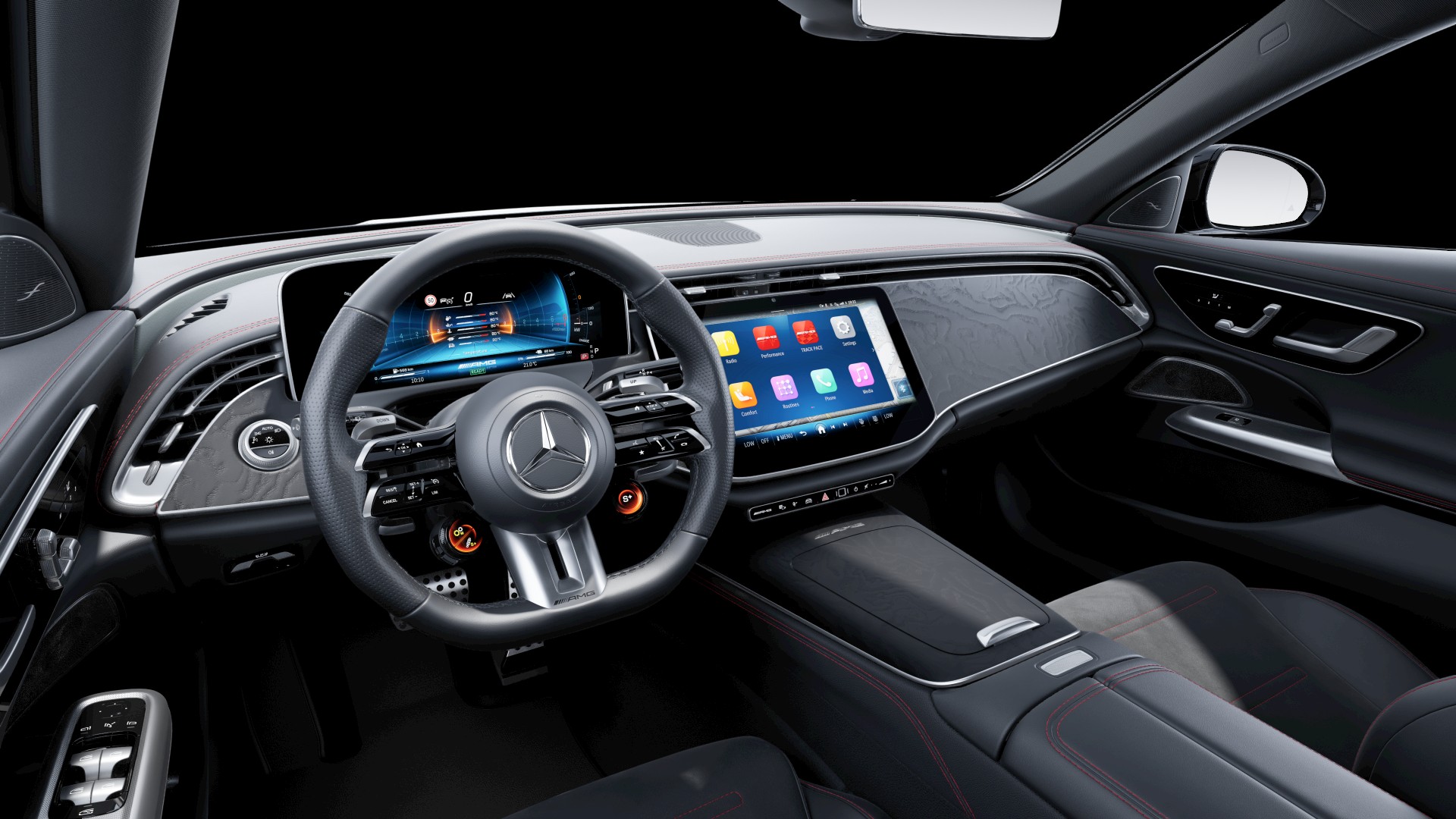 Mercedes-AMG E kombinerar sportig kraft med lyxig elegans. Med högpresterande motorer och avancerad teknik levererar den en dynamisk körglädje, samtidigt som komfort och exklusiv design sätter standarden för premiumsegmentet.Interiör