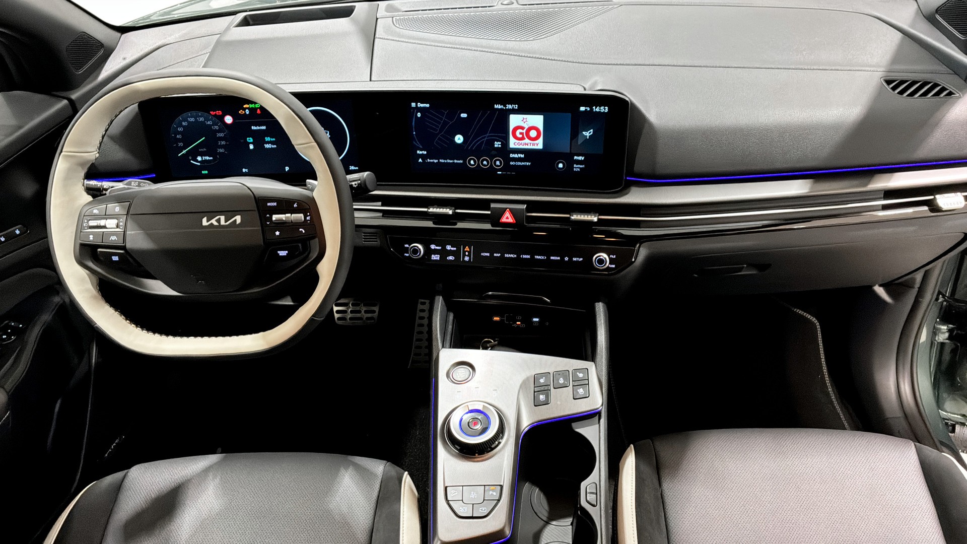 Invändigt möts du av digital 12,3" instrumentering, stor pekskärm med navigation, Apple CarPlay/Android Auto, Harman Kardon-ljudsystem, trådlös mobilladdare och Kia App-uppkoppling. Komforten är hög med elstolar fram (förarstol med minne och svankstöd), ventilerade och eluppvärmda framstolar samt eluppvärmda yttre platser bak. Elbaklucka, nyckelfritt system och Digital Key gör vardagen smidigare.