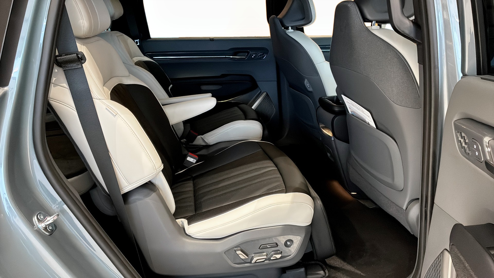 Bilen är fabrikssnygg med 0 mil och kommer i den exklusiva färgen Iceberg Green metallic. Invändigt möts du av en premiumkänsla med helskinnsklädsel, elstolar fram (förarstol med minne), sätesvärme fram och bak, samt sätesfläktar för högsta komfort året runt. Sex separata sittplatser ger alla passagerare gott om utrymme.