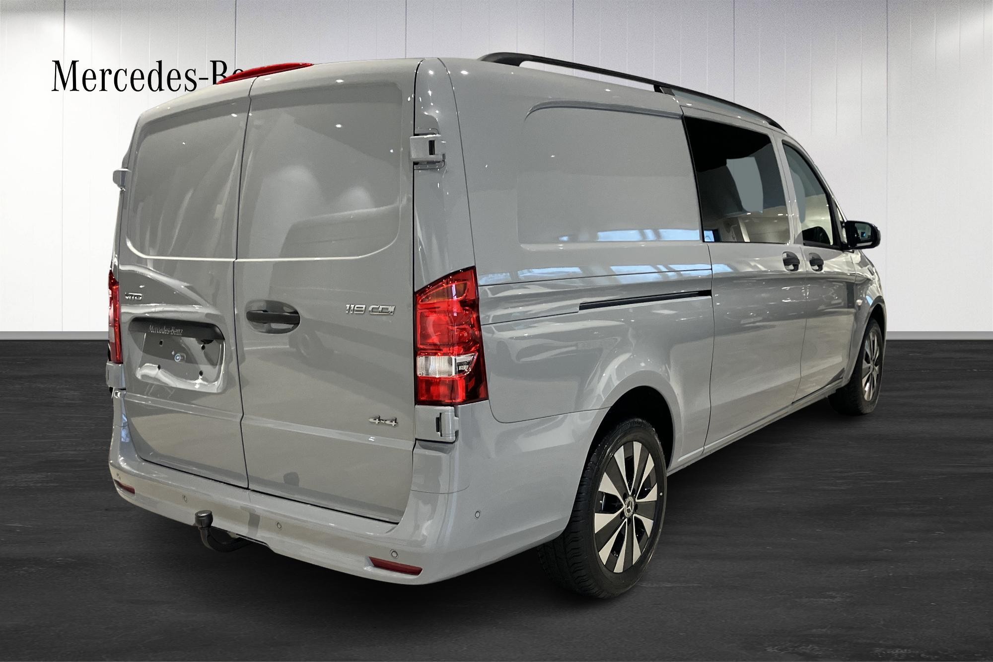 Mercedes-Benz Vito 119 CDI Mixto Extralång PRO 4MATIC, modellår 2025, i elegant Alpingrå – fabriksny och redo för leverans från januari 2026. En perfekt kombination av personbilskomfort och transportbilskapacitet för det proffsiga företaget.