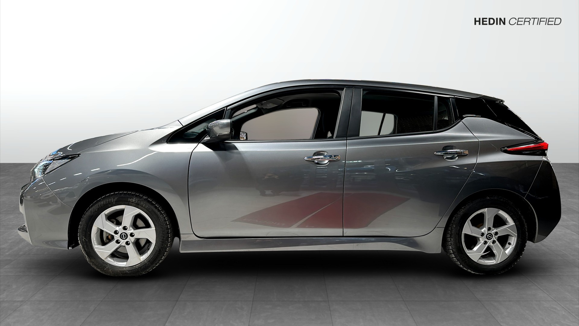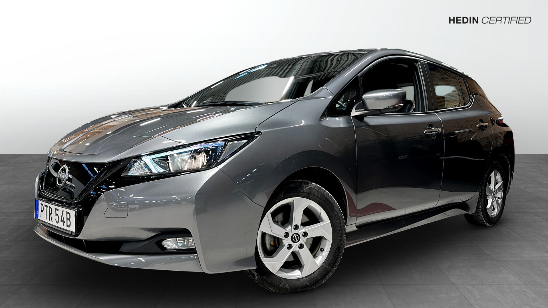 Nissan Leaf Acenta 39 kWh, 2023, i stilsäker färgen Dark Metal Grey – en nästan ny elbil med endast ca 3850 mil på mätaren. Första registrering 2023-11-30 och Hedin Certified för extra trygghet.