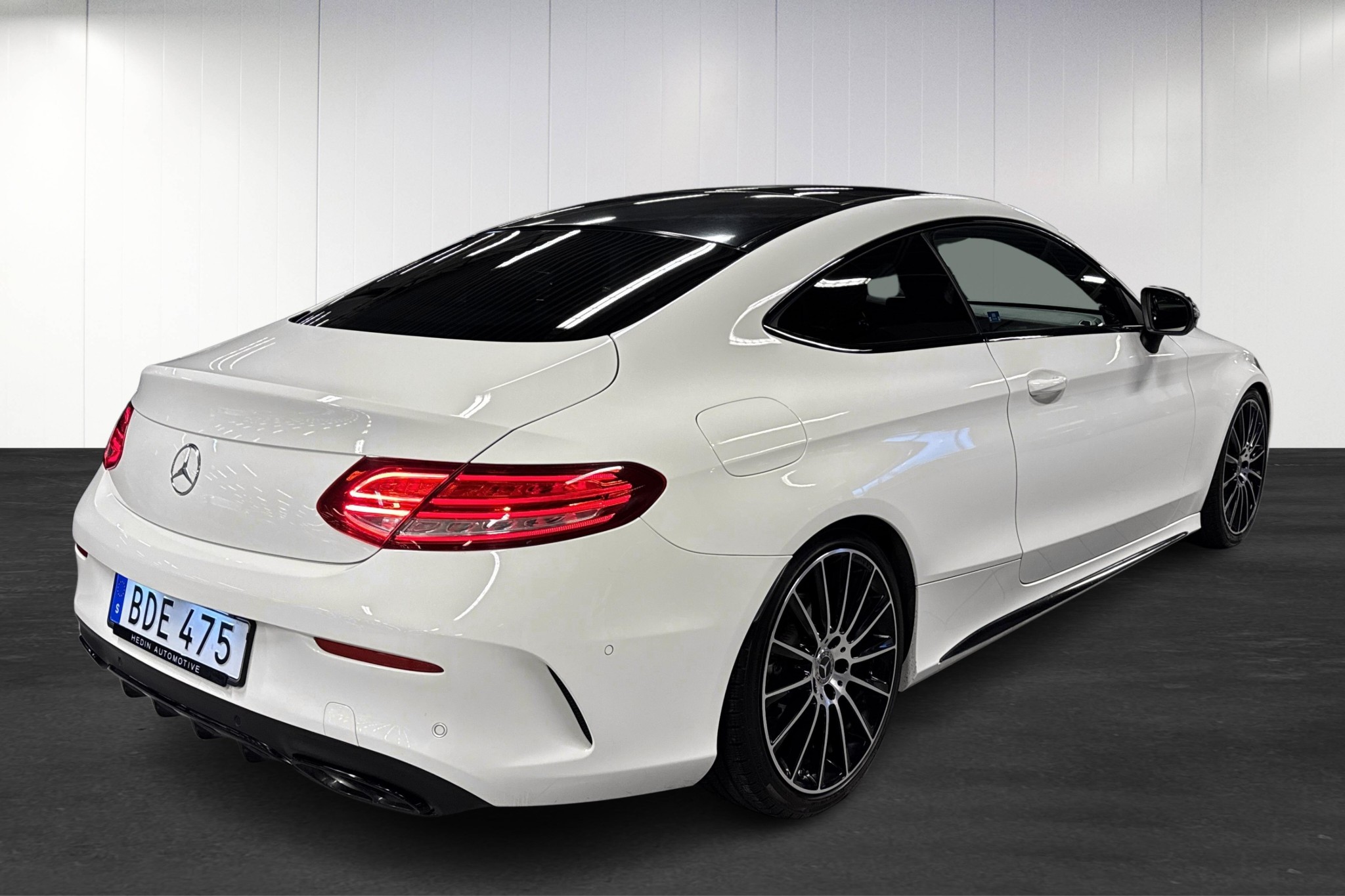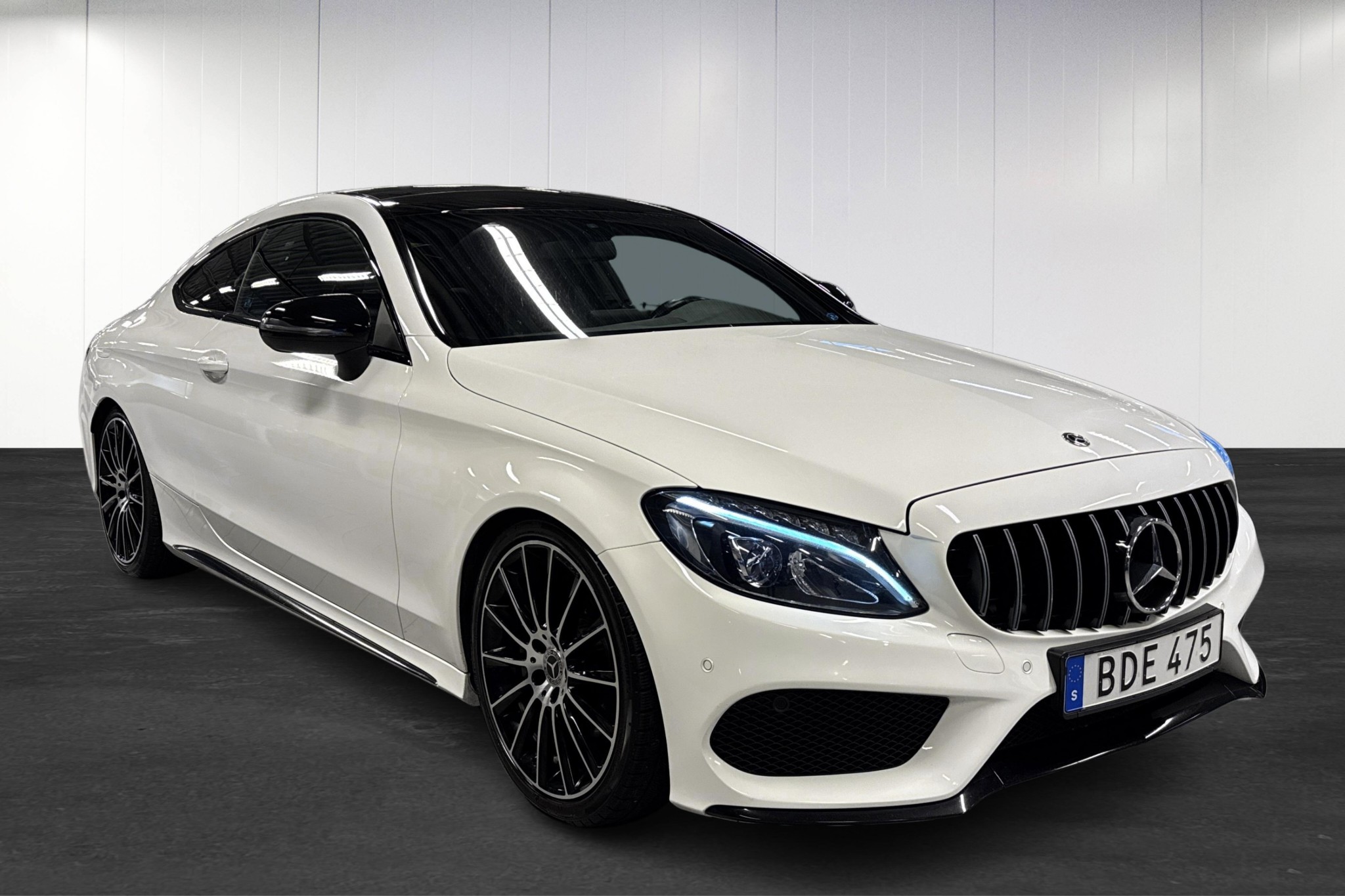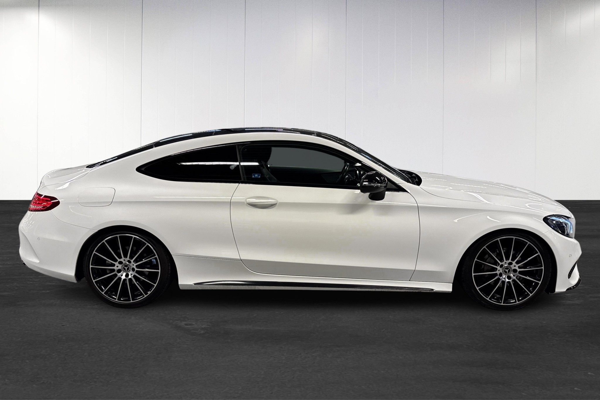 Mercedes-Benz C 220 d Coupé AMG Line, 2018, i elegant polarvit – en sportigt lyxig bil med låg bränsleförbrukning och rätt känsla bakom ratten. Endast ca 9900 mil, automatlåda (9G-Tronic) och stark men snål dieselmotor på 170 hk.