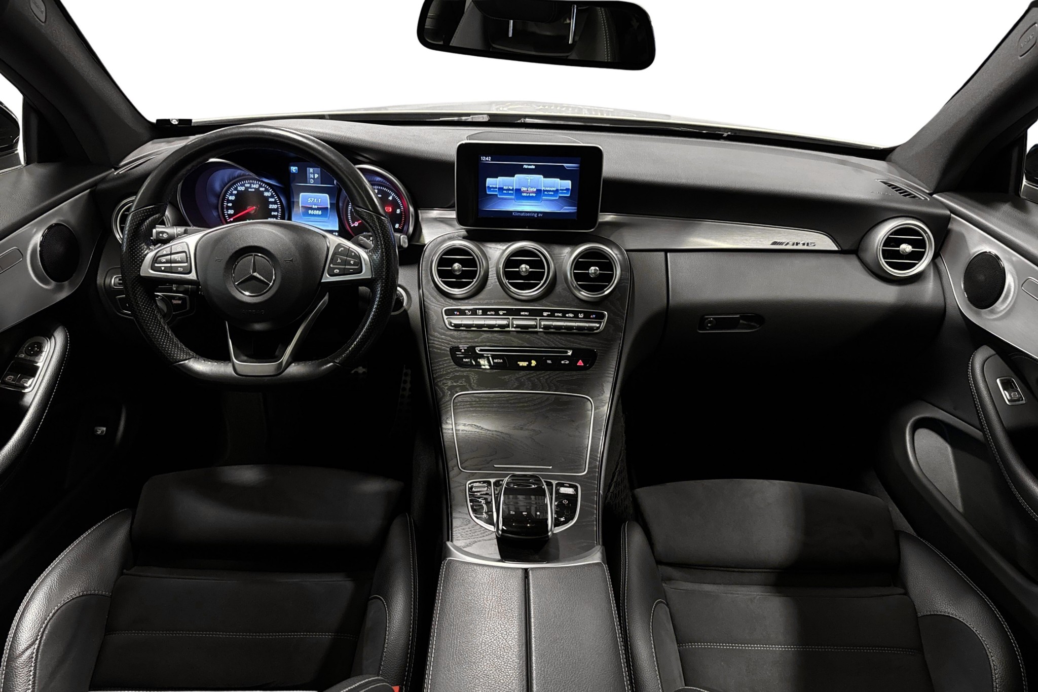 Invändigt får du bland annat eluppvärmda framstolar med svankstöd och säteskomfortpaket, AMG-velourmattor, interiörbelysningspaket och öppetporiga svarta dekorpaneler som förstärker premiumkänslan.