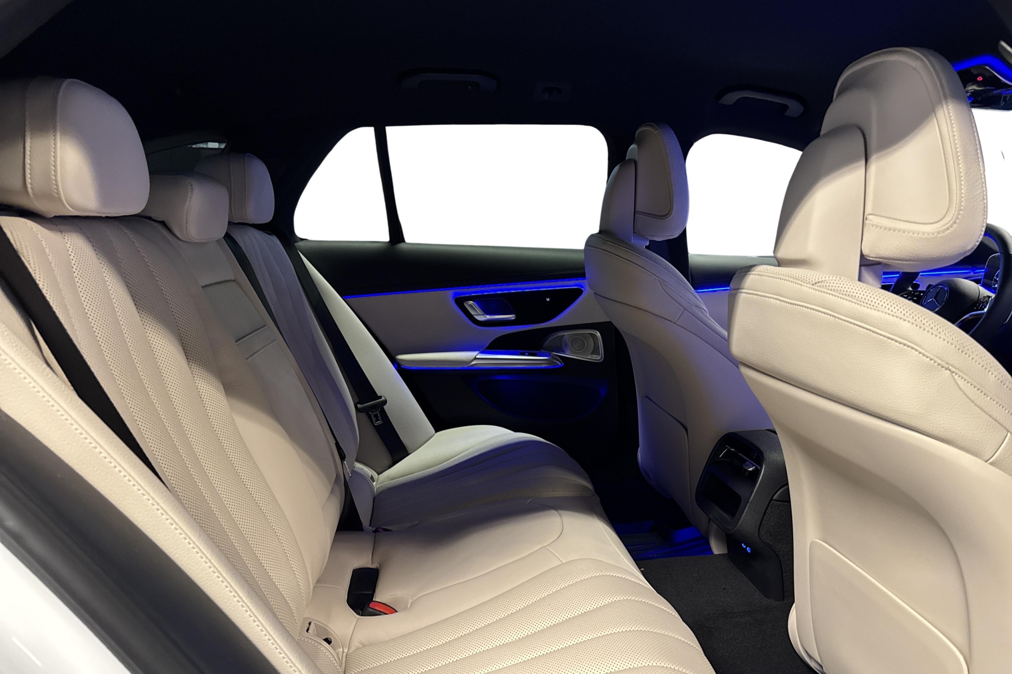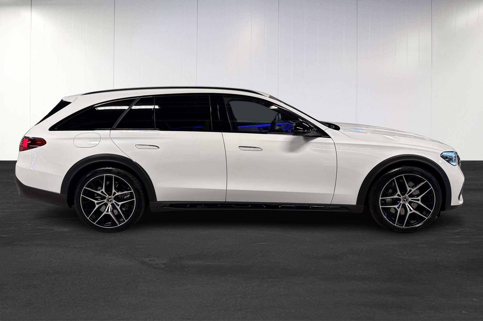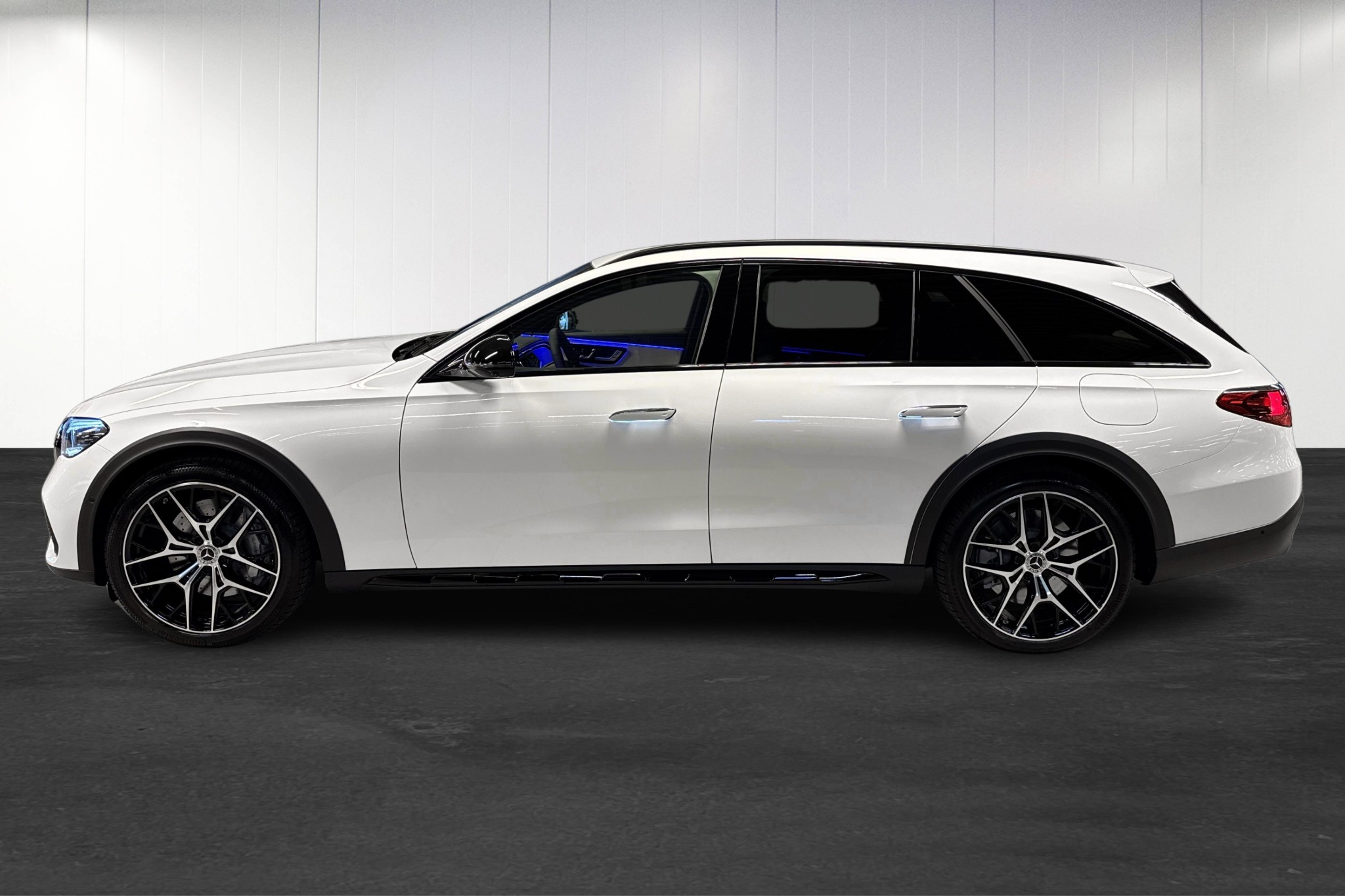 Bilen är en vit MANUFAKTUR Opalitvit Bright All-Terrain med Nightpackage, AMG lättmetallfälgar och Avantgarde interiör – en riktigt elegant och modern kombination. Invändigt möts du av lyxig macchiatobeige/svart läderklädsel, komfortstolar med ventilation, svart innertak och öppenporig svart ask i paneler och mittkonsol. Minnespaket, eluppvärmd multifunktionsratt och avancerad ambient/panelbelysning höjer premiumkänslan ytterligare.