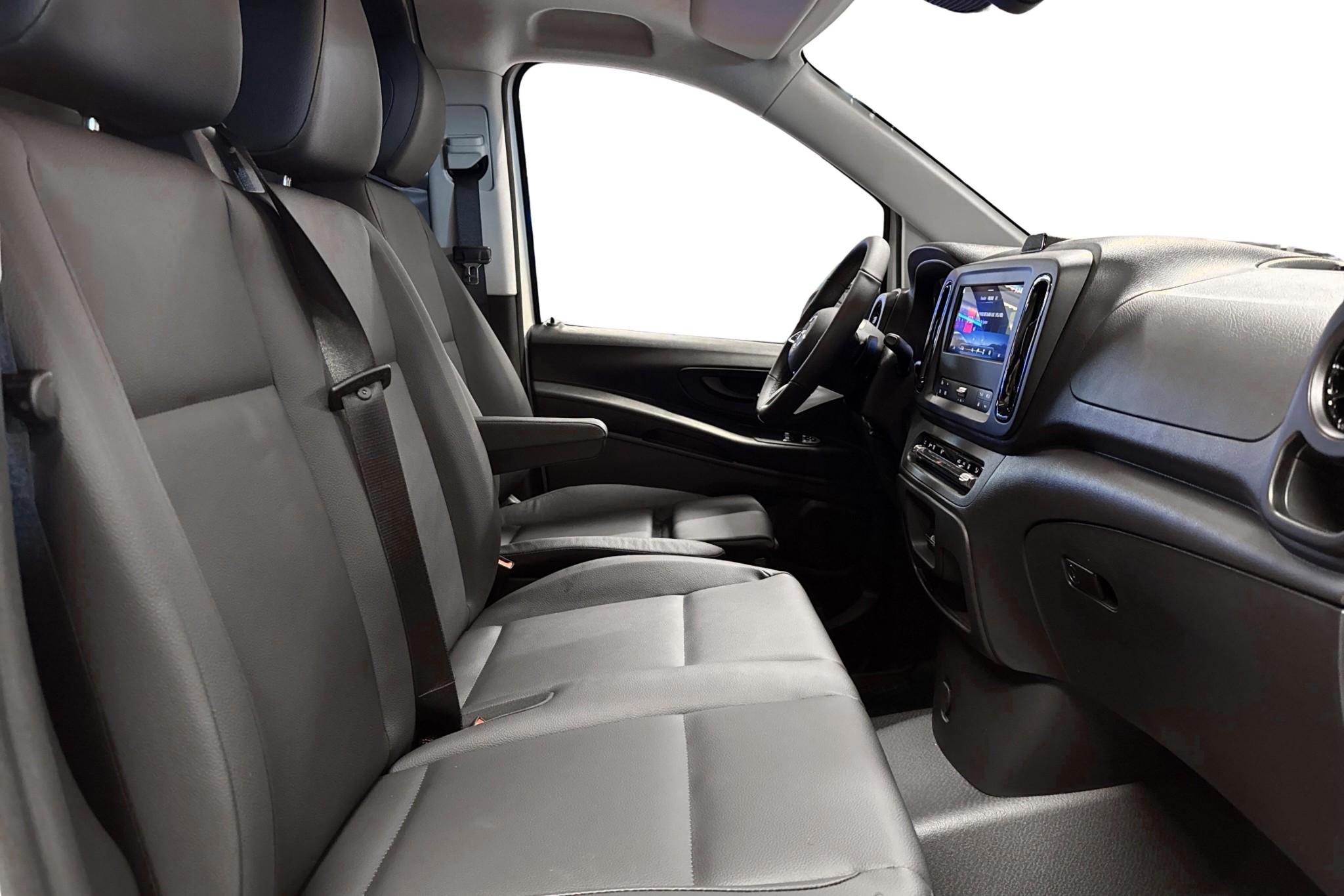 Föraren sitter bekvämt i komfortsäte med svankstöd, läderratt och justerbar sits. Kupévärmare med tidur, vinterpaket, eluppvärmda stolar och värmedämpande rutor runtom gör bilen idealisk för nordiskt klimat. MBUX multimediasystem med smartphoneintegration, färgdisplay och DAB-radio ger en modern och uppkopplad arbetsplats.