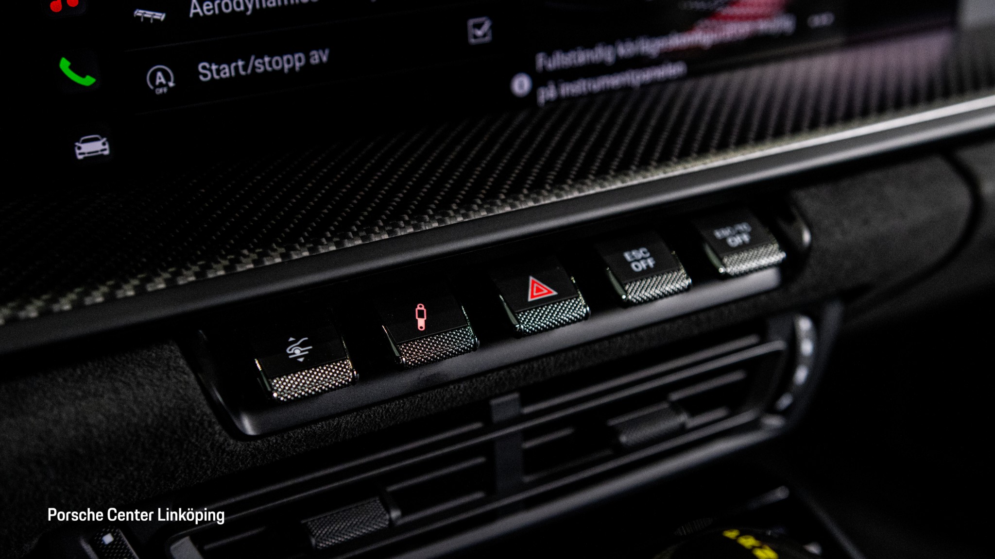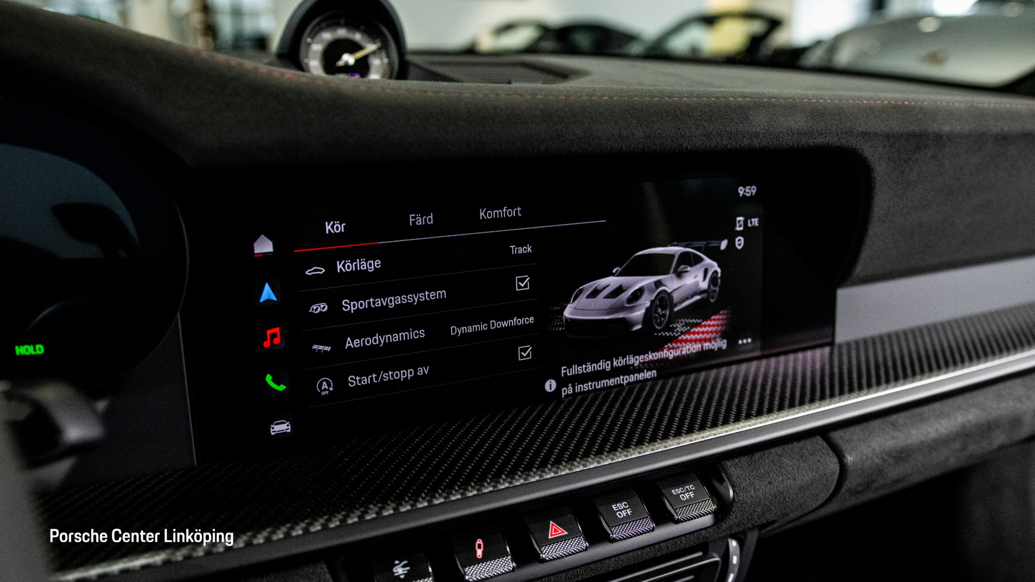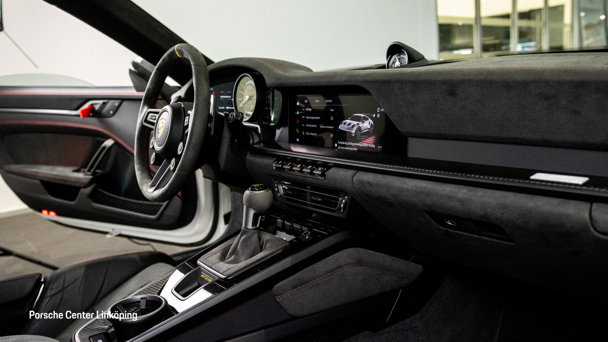 Invändigt möts du av en renodlad förarmiljö med Club Sport-paket, Race-Tex-detaljer, GT3 RS-multifunktionsratt, belysta instegslister i kolfiber och Sport Chrono. BOSE Surround Sound System, LED Matrix-strålkastare (svarta), Park Assist med backkamera, ljuspaket och automatisk avbländning av backspeglar gör bilen fullt användbar även utanför banan.
