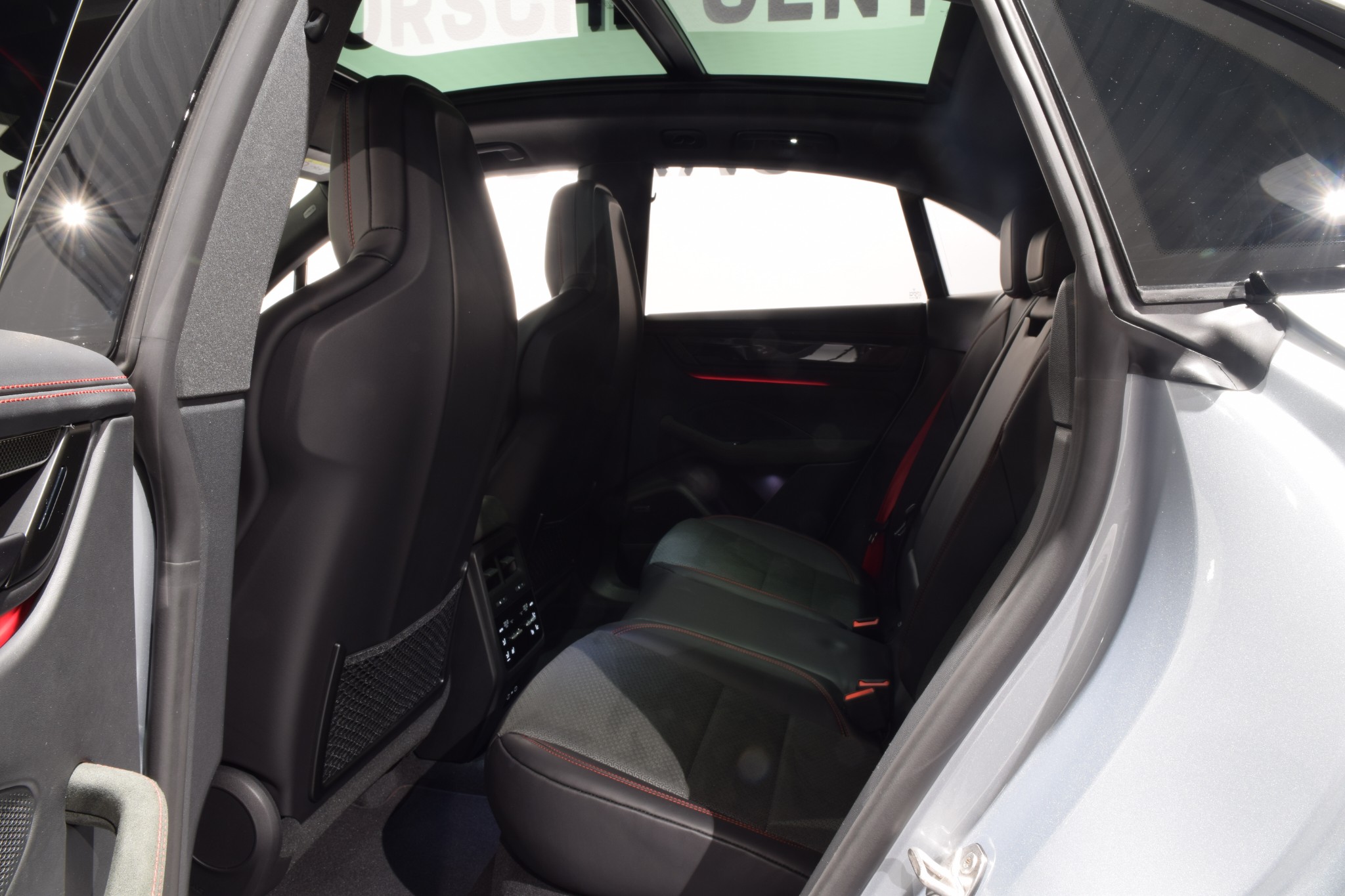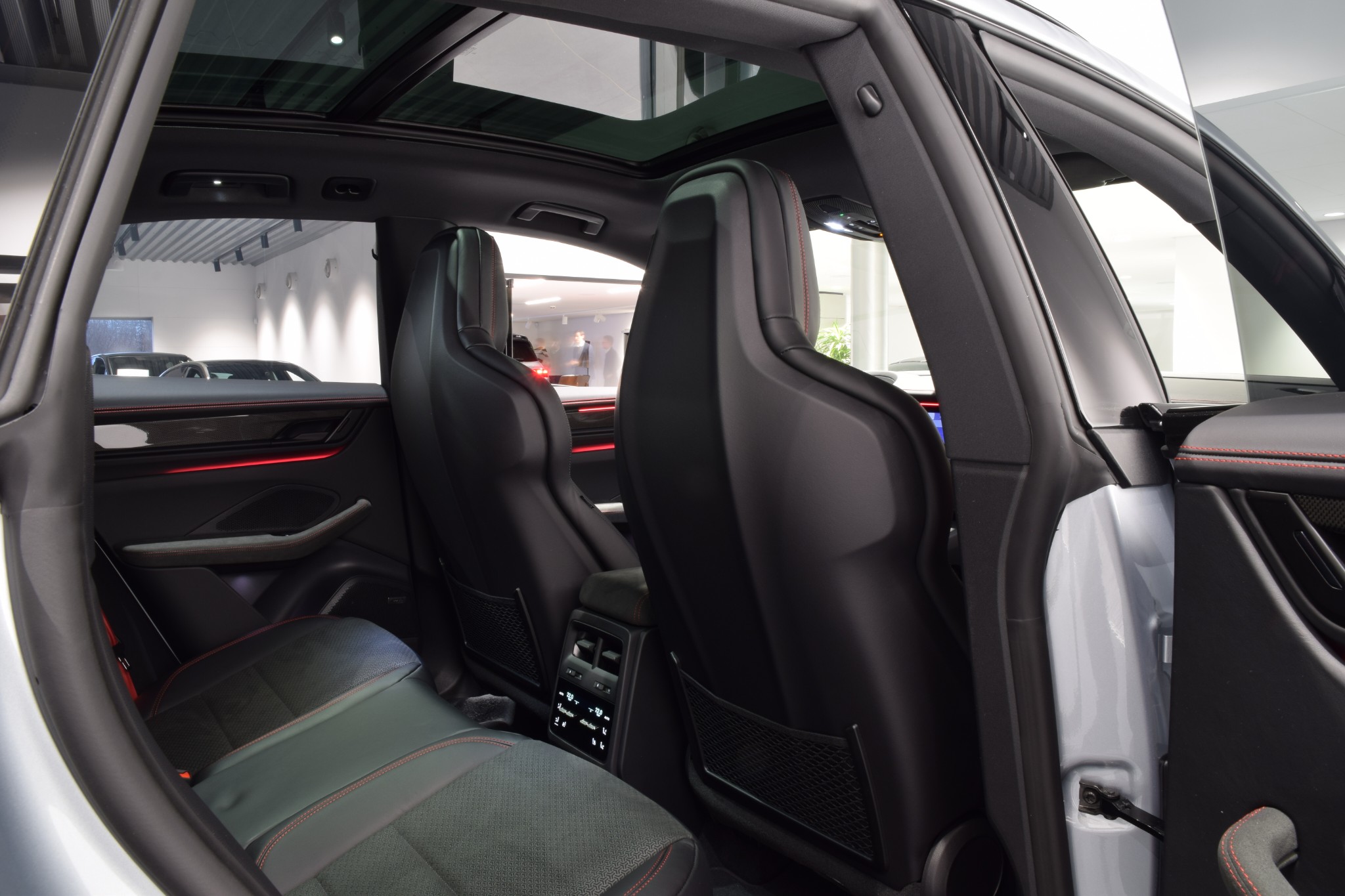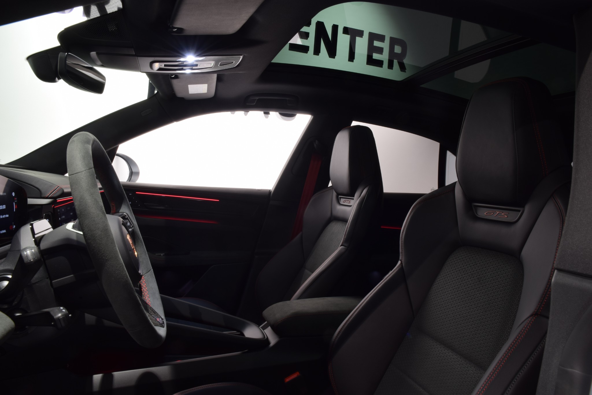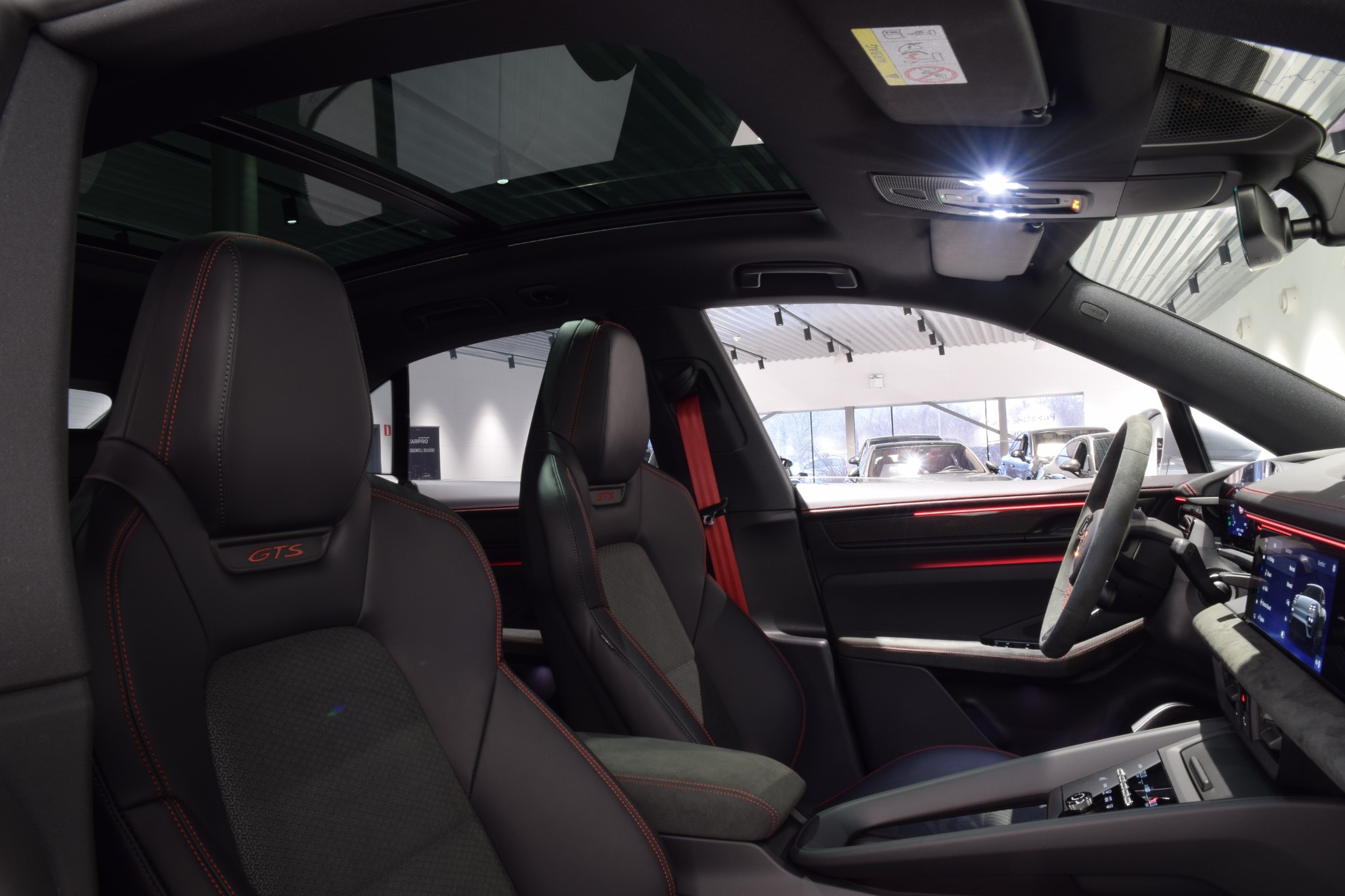Kupén är sportig och exklusiv med GTS-interiörpaket i Carmine Red, kolfiberinlägg, GT-sportratt i Race-Tex (eluppvärmd) och 4-zons klimatanläggning. Komforten lyfts ytterligare av panoramatak, ljud- och värmeisolerglas, eluppvärmd vindruta, uppvärmda baksäten och förvaringspaket. ISOFIX även på passagerarstol underlättar för barnfamiljen.