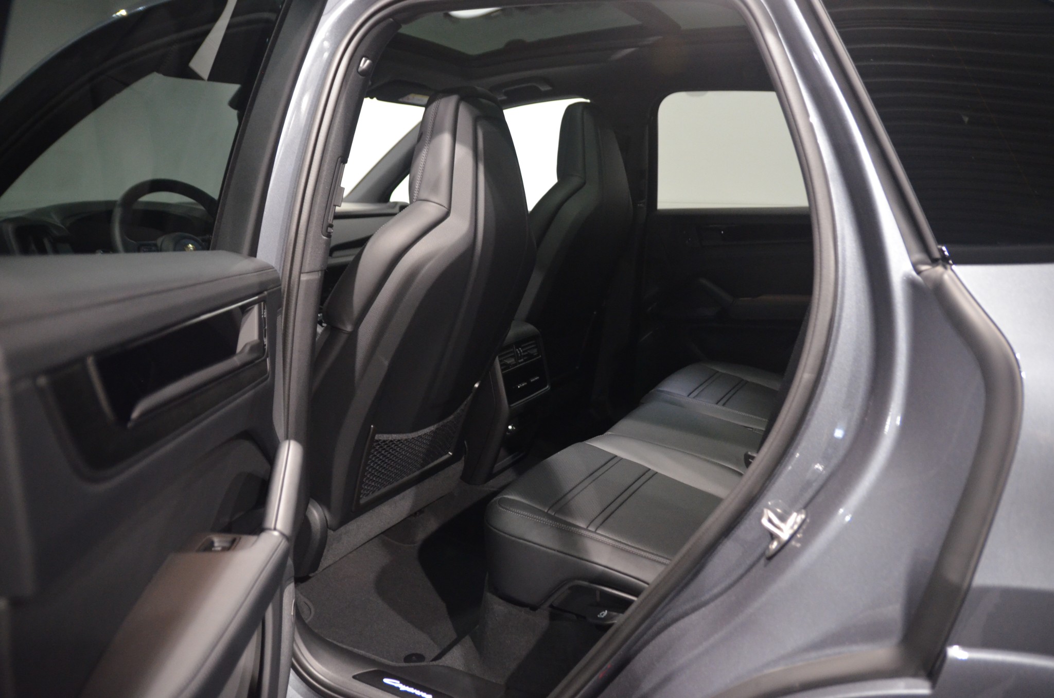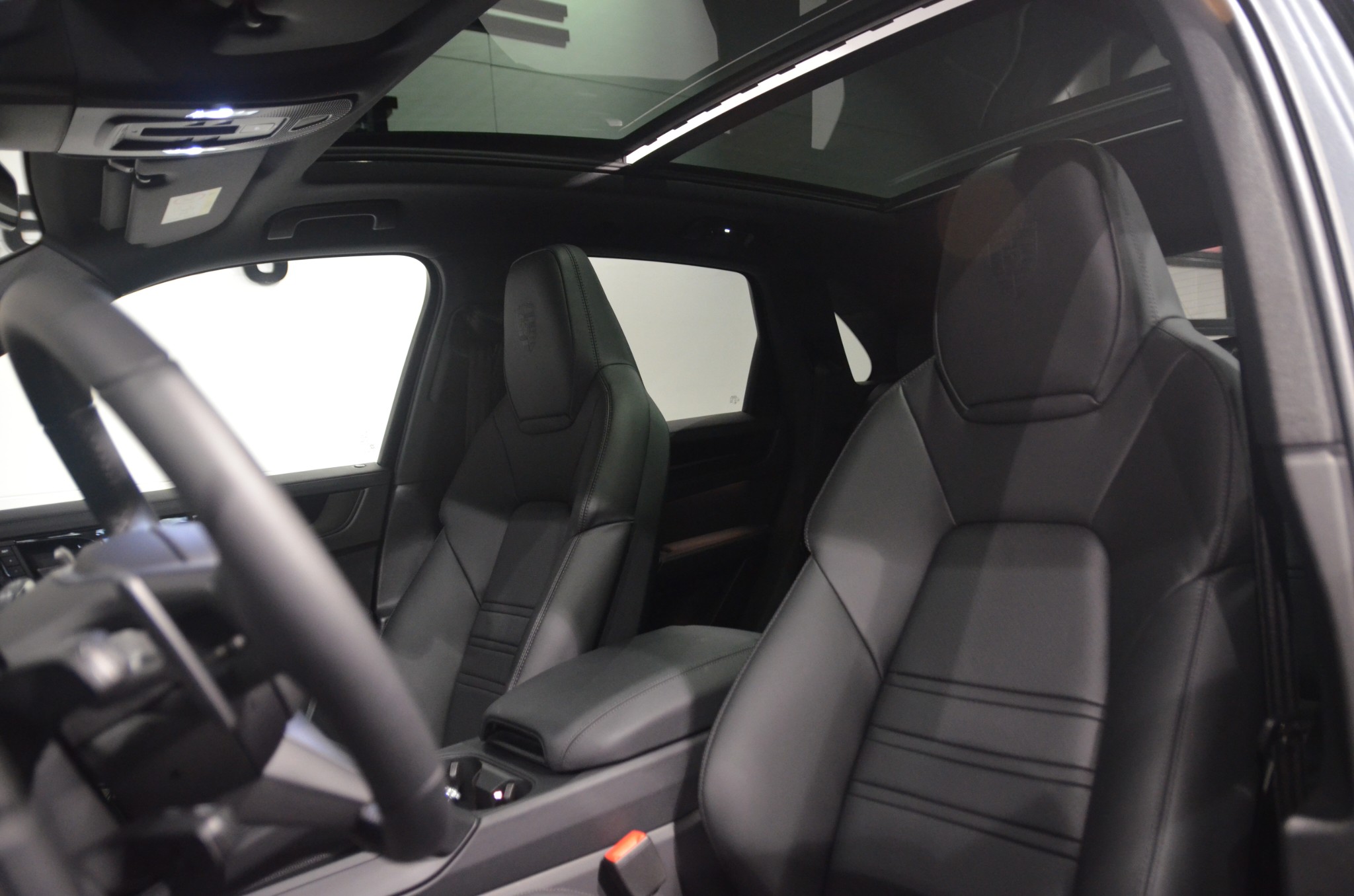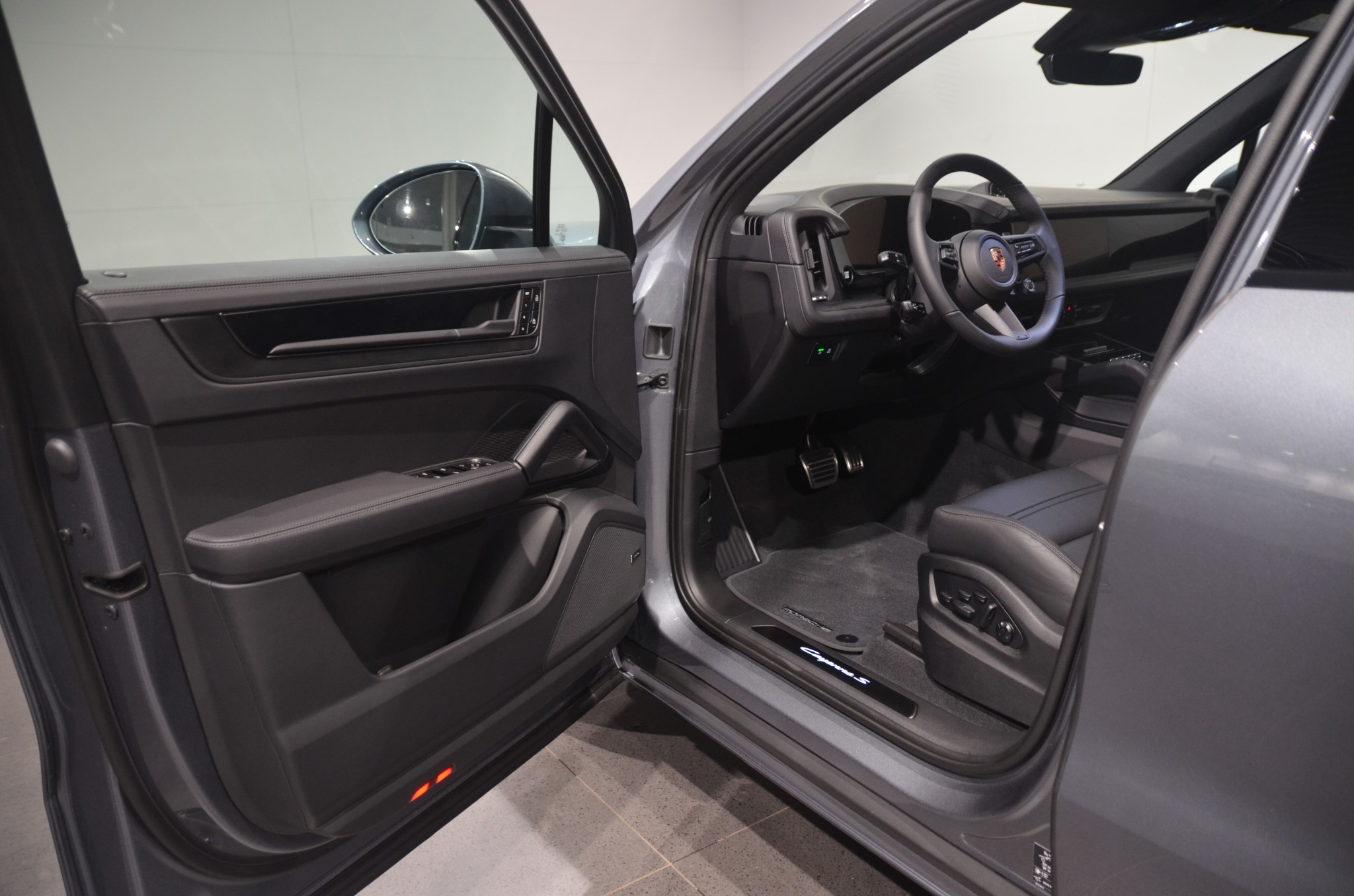 Bilen är fabriksny, i den eleganta färgen Vanadium Grey Metallic med svarta detaljer, 22" 911 Turbo Design-fälgar, svarta högblanka bromsok, tonade bakljus och svart takreling – en riktigt kaxig Black Edition-look. Interiören domineras av svart läder med Porsche-vapen präglade i nackstöden och adaptiva 18-vägs sportstolar som ger både stöd och komfort. Fram- och baksäten är eluppvärmda.