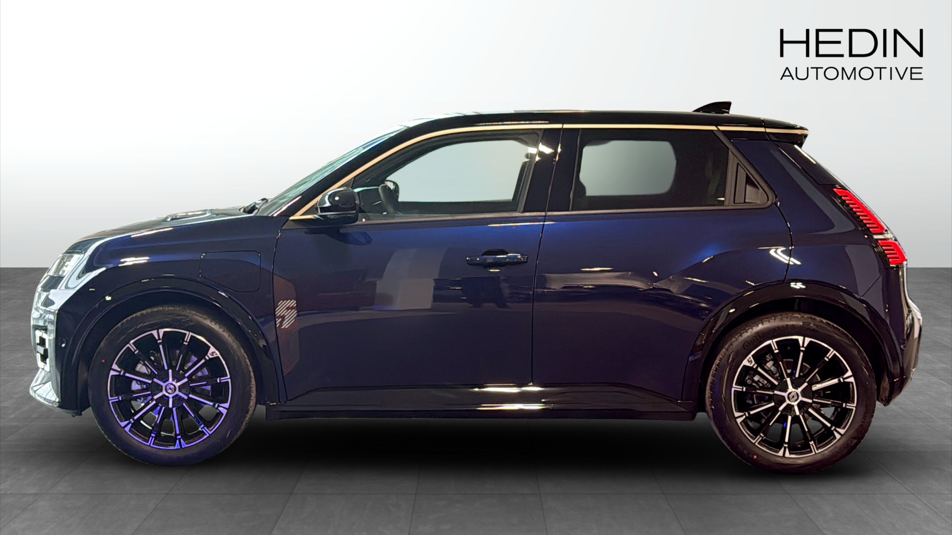 Renault 5 E-TECH ICONIC FIVE EV52, årsmodell 2026 – en helt ny, elektrisk småbil med modern teknik och klassisk design i en snygg Midnight Blue med svart tak. Noll mil på mätaren och redo för leverans från Hedin Automotive Segeltorp.