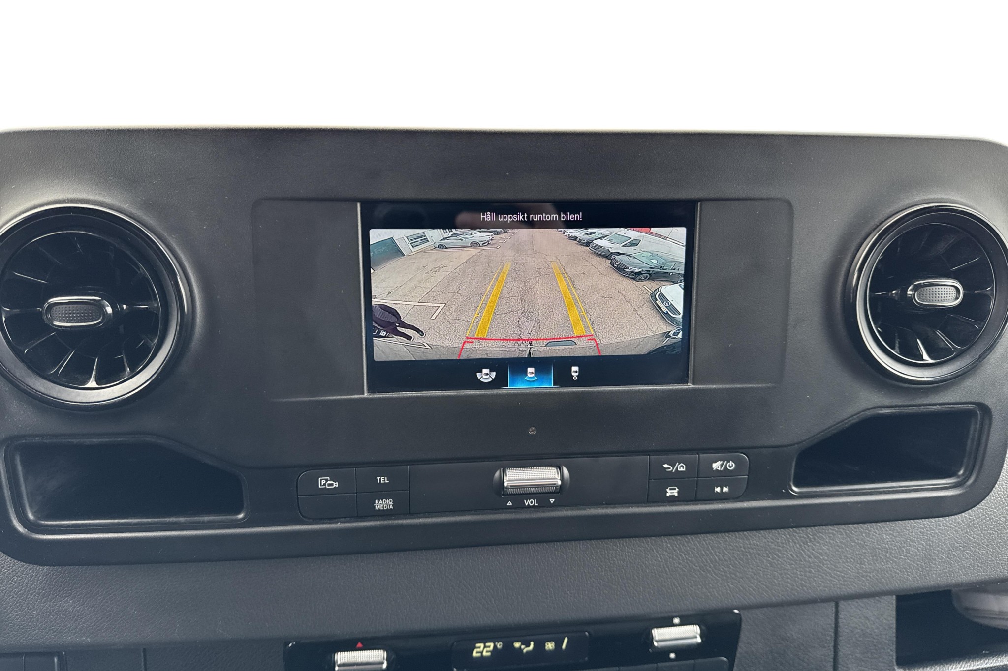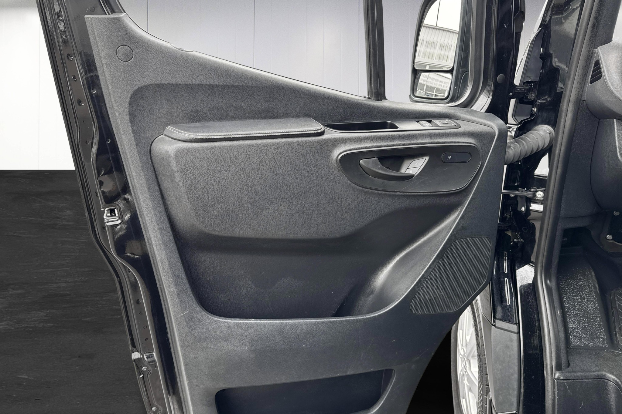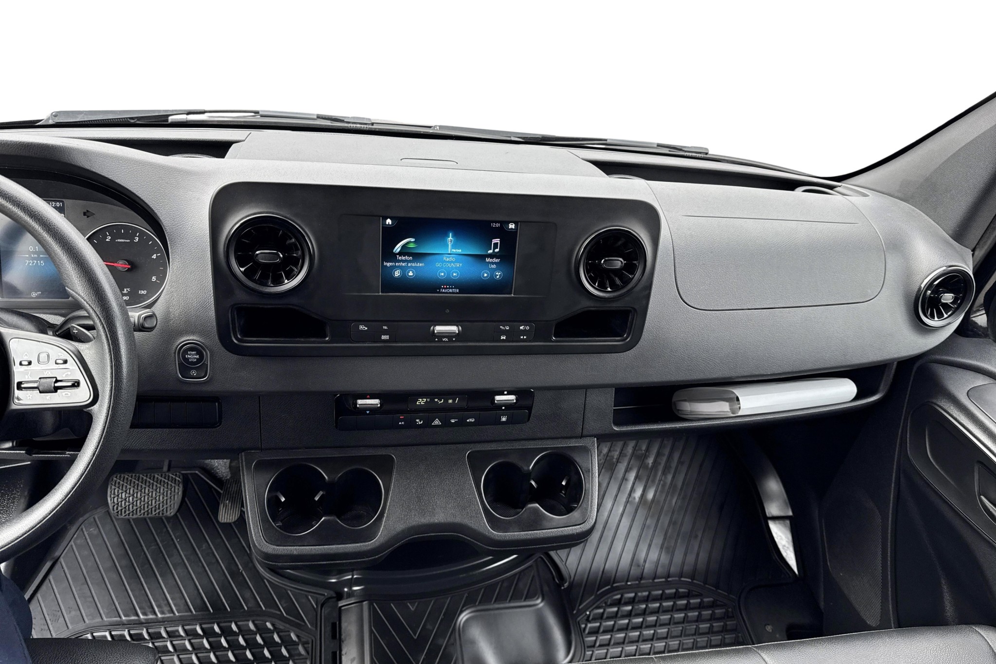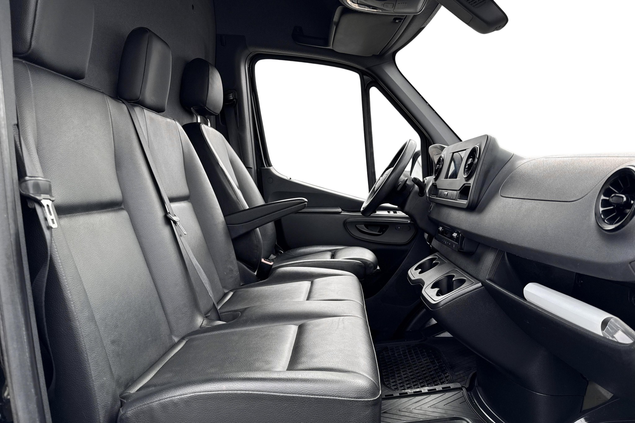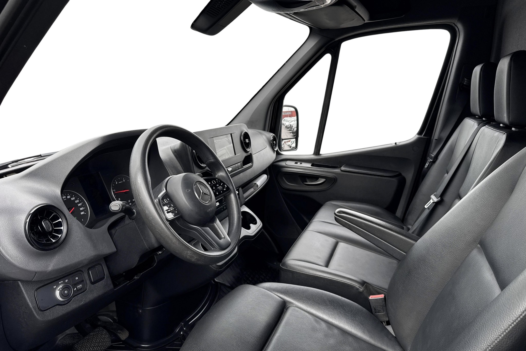 Förarplatsen håller typisk Mercedes-Benz-klass: fjädrande komfortförarstol med armstöd, svankstöd och eluppvärmning, svart ARTICO konstläder, multifunktionsratt (höjd- och längdjusterbar), hylla ovanför vindrutan och flera smarta förvaringslösningar. Kupévärmare med tidur ger en varm och isfri bil vintertid.