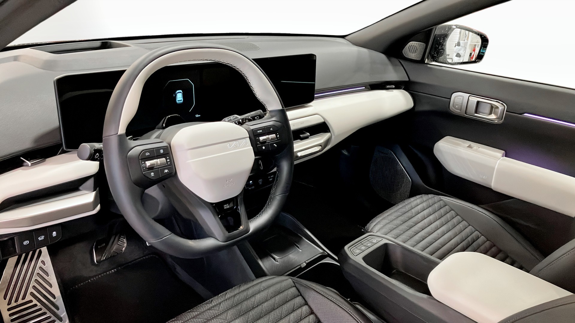 Den svarta exteriören flödar av sofistikerad design, ackompanjerad av en rymlig interiör fylld med avancerade funktioner. Från två stora 12,3-tums skärmar och en head-up display till ett förstklassigt Harman Kardon-ljudsystem – varje detalj är skapad för din komfort och underhållning. Med uppvärmda och ventilerade stolar, rattvärme och en energibesparande värmepump är Kia EV4 redo att hantera alla årstider.