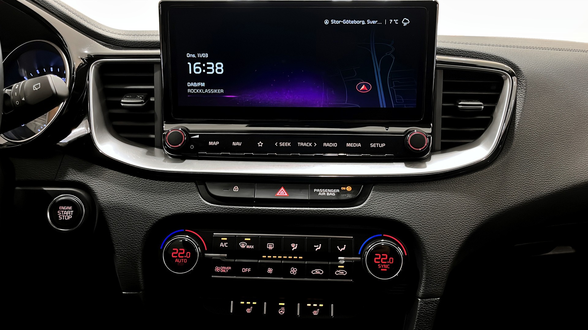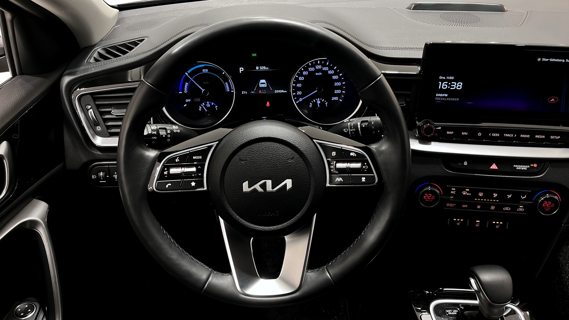 Modern säkerhets- och förarassistans: adaptiv farthållare, filhållningsassistans, autobroms, döda vinkel-varning samt backkamera och parkeringssensorer bak som gör parkering enkel. För uppkoppling och underhållning finns Apple CarPlay, Android Auto, Bluetooth, GPS och handsfree.