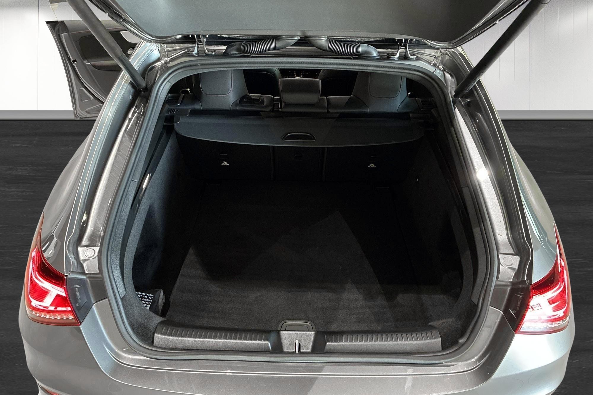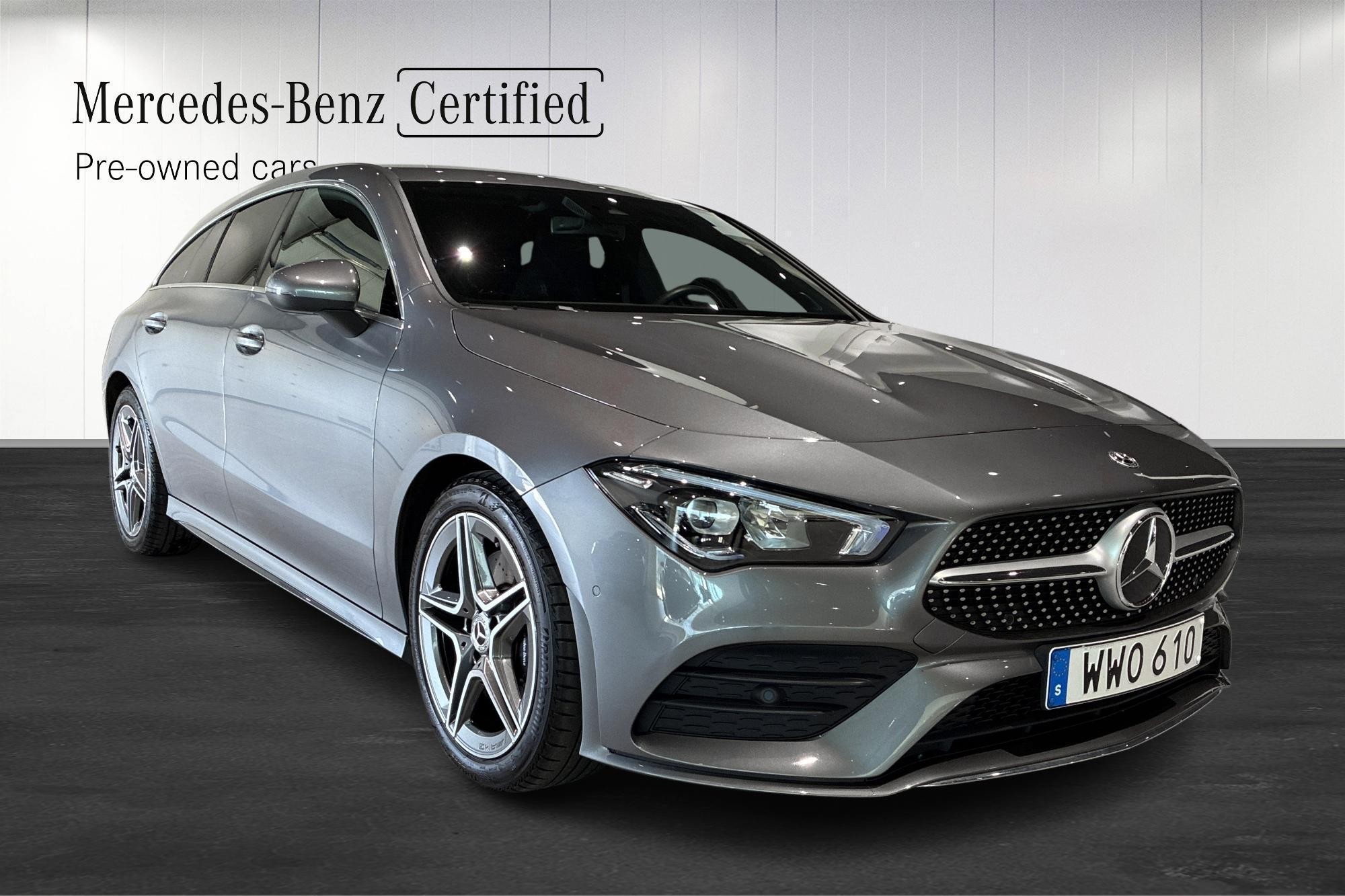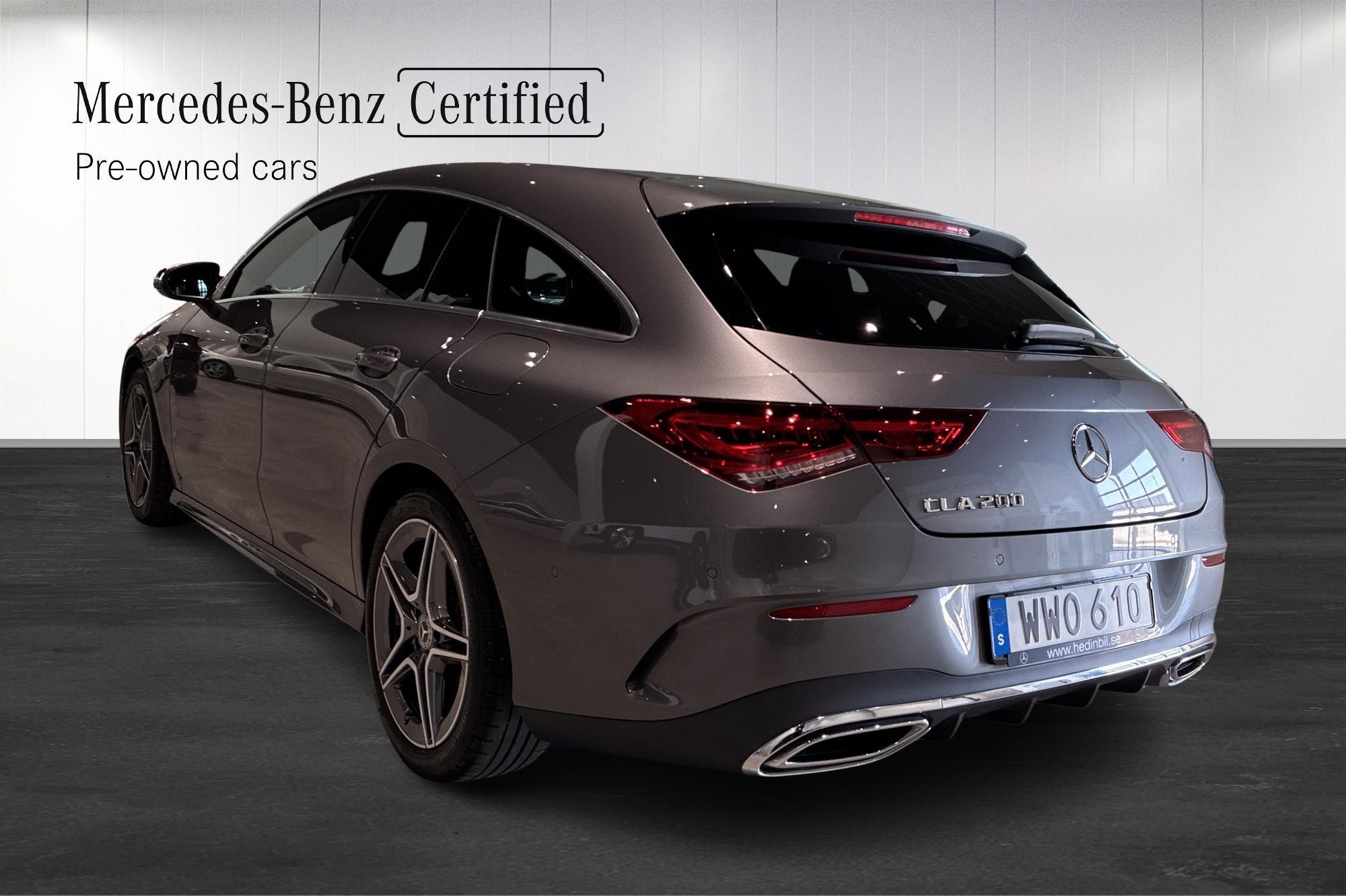 Mercedes-Benz CLA 200 Shooting Brake AMG Line, årsmodell 2023, i elegant bergsgrå metallic – en nästan ny bil med endast ca 2510 mil på mätaren. Här får du kombinationen av sportig design, praktisk kombi-kaross och premiumkänsla rakt igenom.