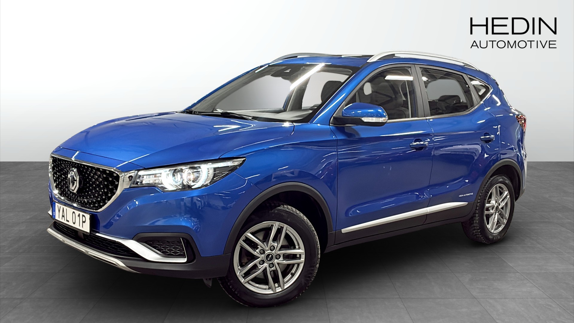 MG ZS EV Luxury 45 kWh, årsmodell 2021, i den snygga färgen Regal Blue – en modern och smidig el-SUV med riktigt låg körsträcka på endast ca 450 mil.
