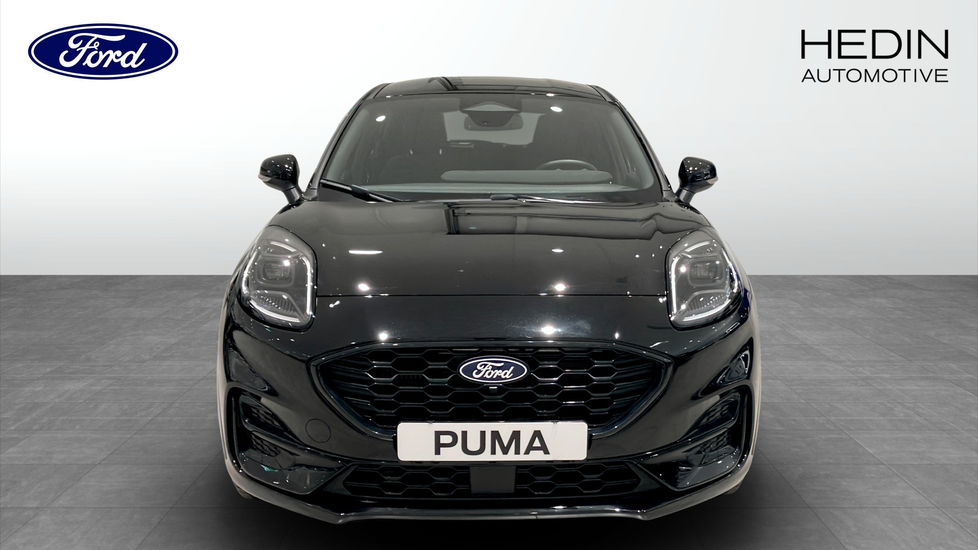 Ford Puma 1.0 EcoBoost Hybrid Powershift ST-Line, årsmodell 2025, i eleganta färgen Agate Black. En nästan ny, svensksåld bil med endast ca 1 920 mil och smidig automat – perfekt som bränslesnål och sportigt utseende SUV för både vardag och pendling.
